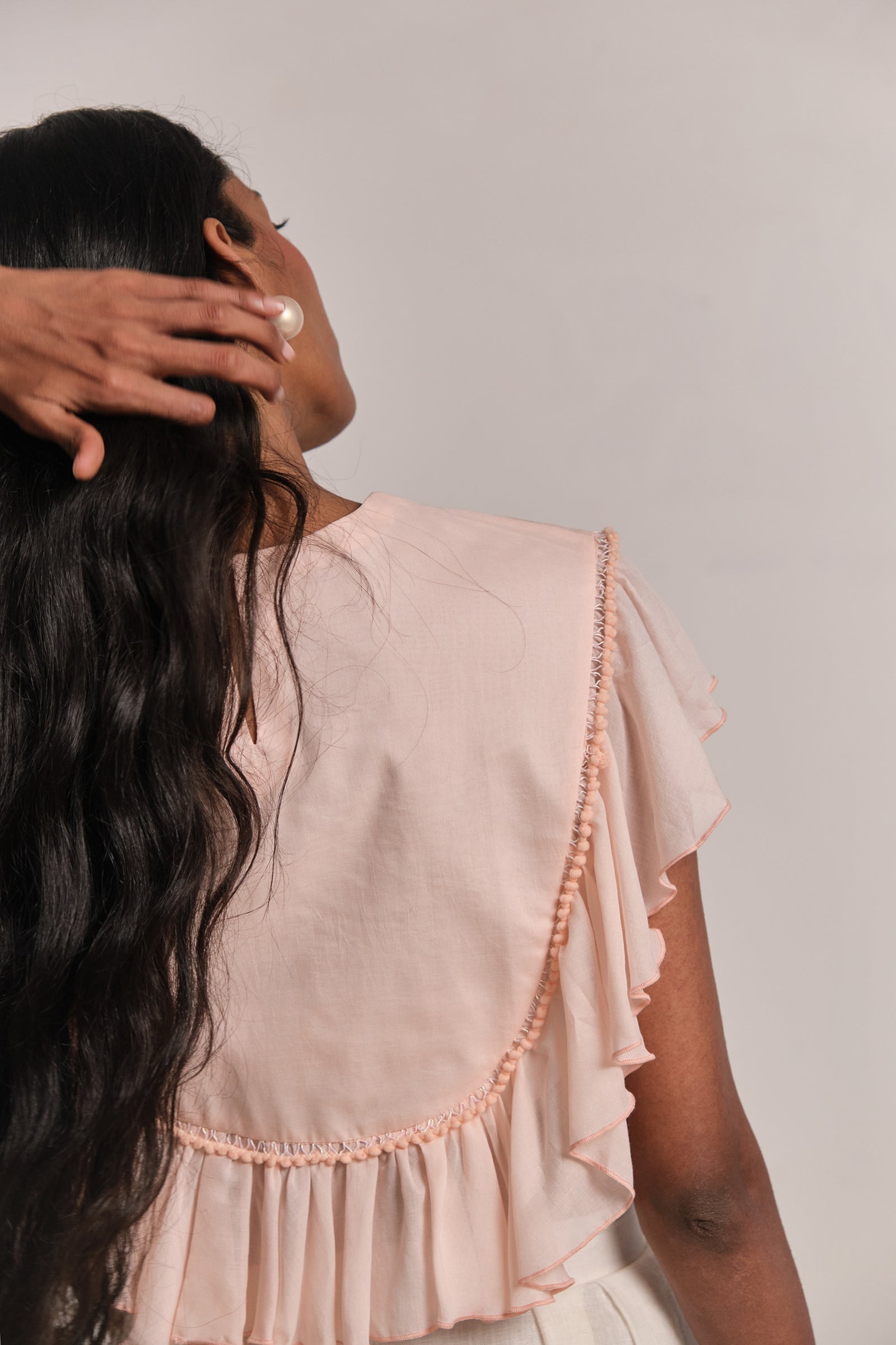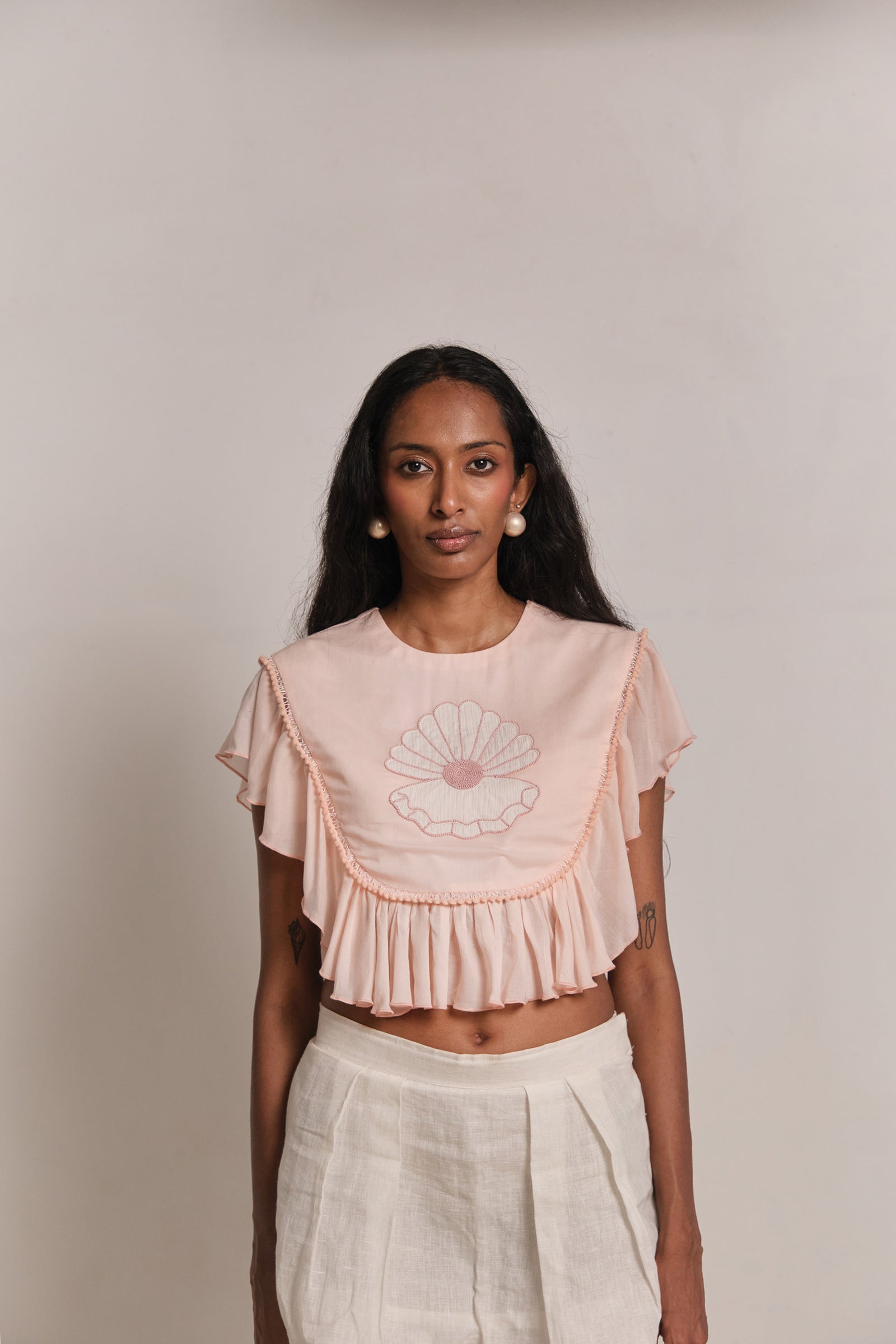 Romantic and statement-making, this cropped all ruffles blouse blends bohemian elegance with true femininity. The semi-sheer fabric and mother-of-pearl embroidery add a touch of elegance to the piece. A lined bodice ensures comfortable wear, while the fitted waist and high neckline create a structured contrast to the airy design—making it a standout choice for elevated styling.