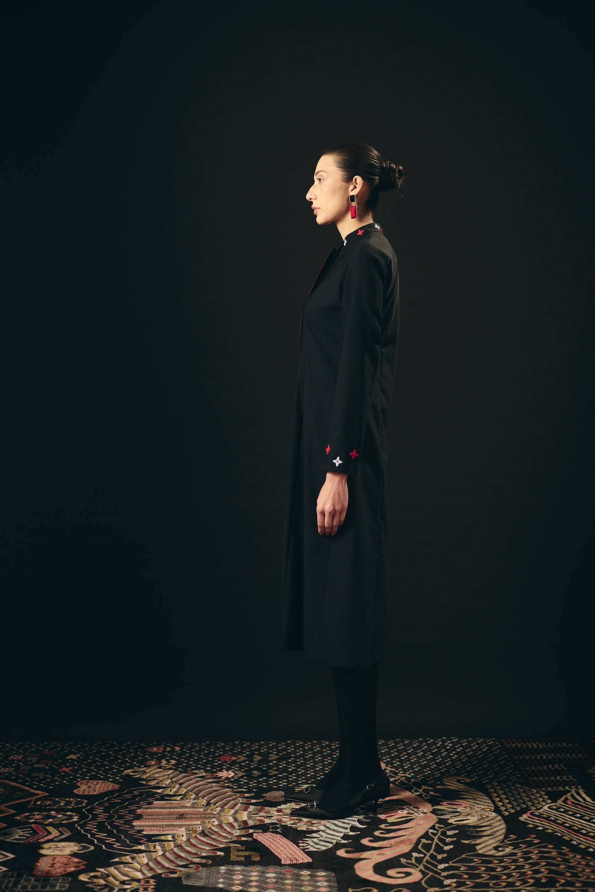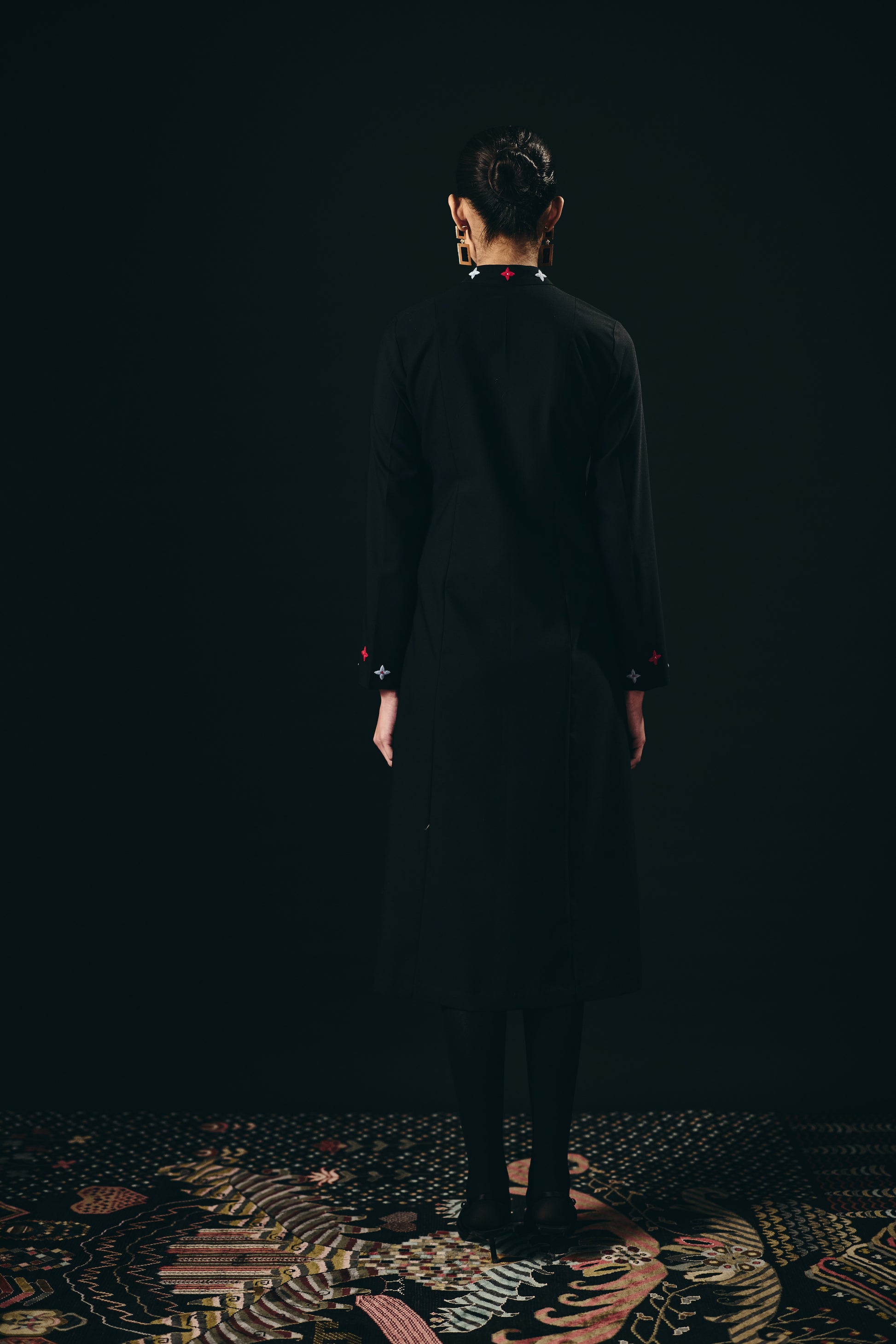 Part of the "She Rises" collection by Shimona.in, this black wool dress is a masterclass in minimal elegance and meaningful detail. The collection celebrates the journey of the modern woman, blending classic tailoring with contemporary accents.