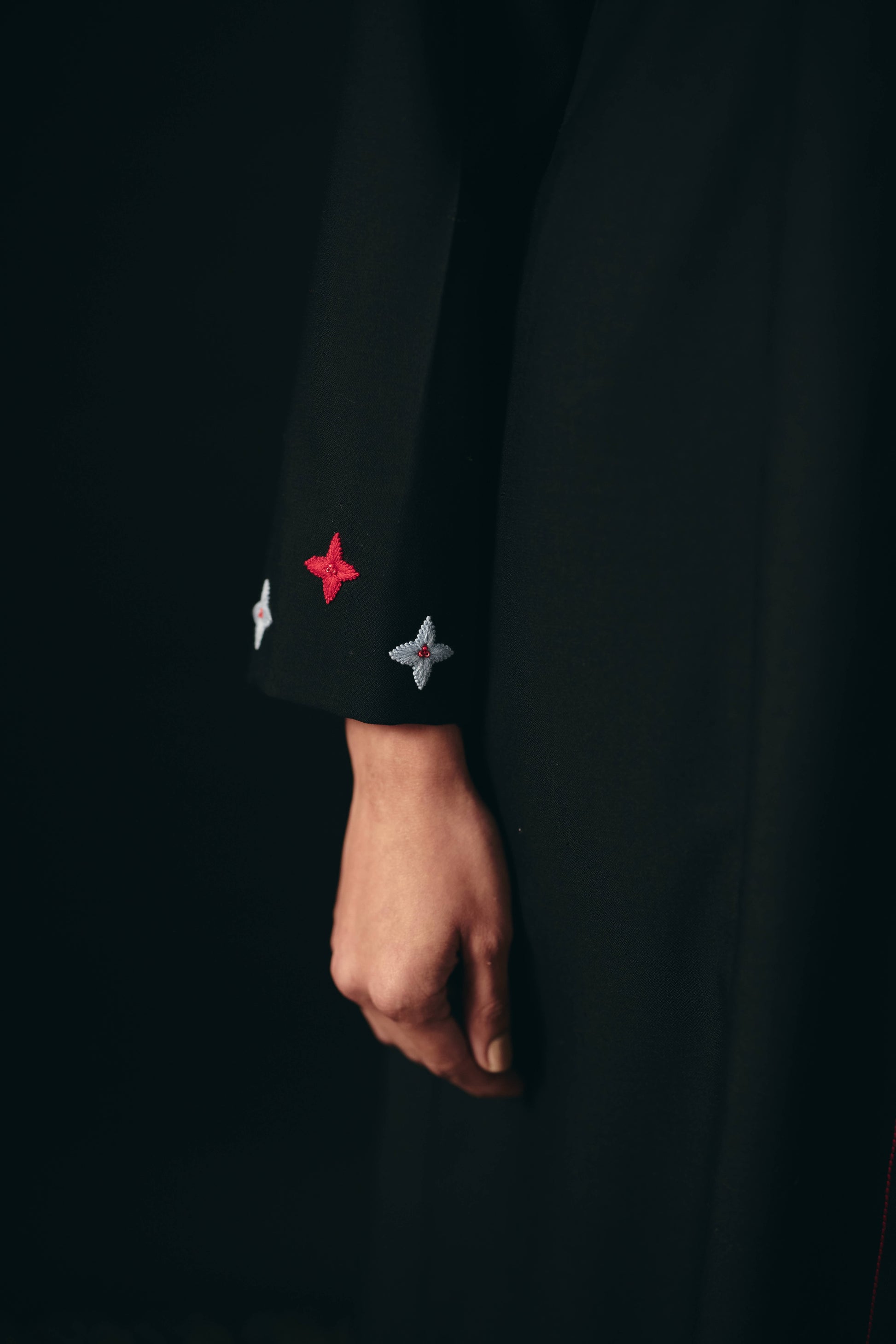 - The sleeve hem mirror the collar’s design, featuring embroidered star patterns in blue and red.