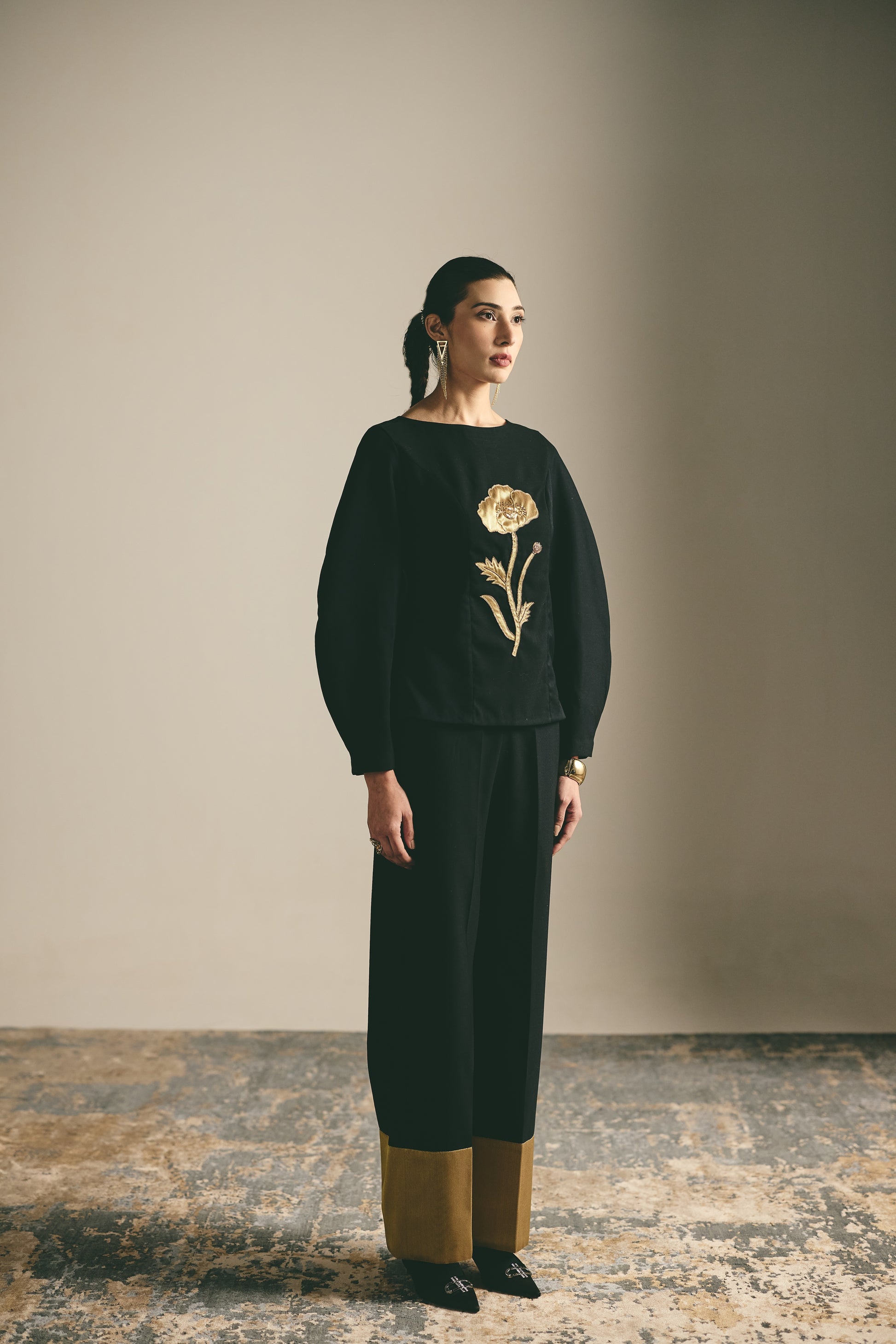 Make a striking, artistic statement with this masterfully tailored two-piece set from the "SHE RISES" collection. Blending modern volume with this piece of "Exceptional Embroidery," this ensemble is designed for the woman who values minimalist luxury with a bold, focal point.This set offers a playful yet sophisticated take on modern monochromatic dressing.
