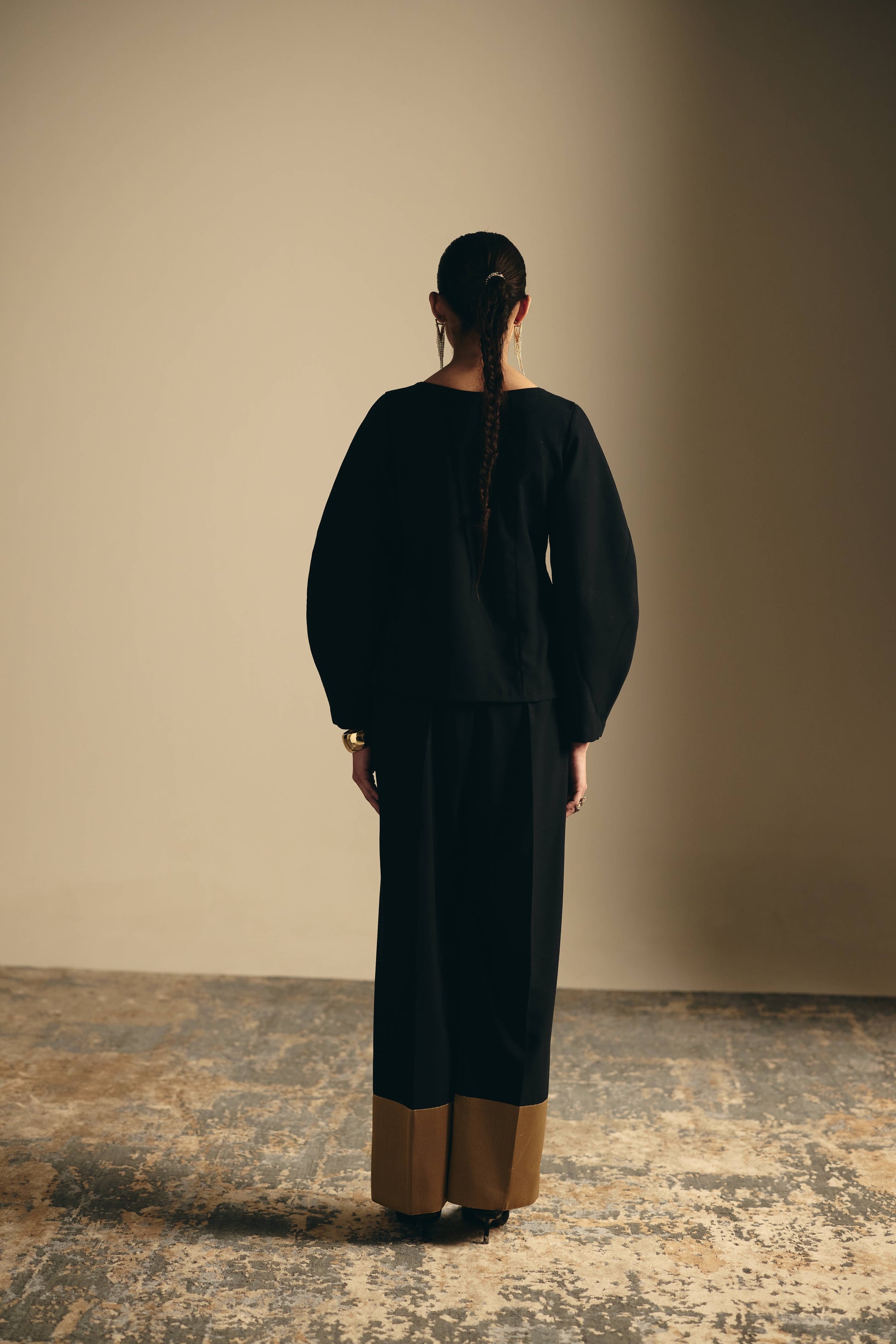 - Matching straight-leg black trousers.
