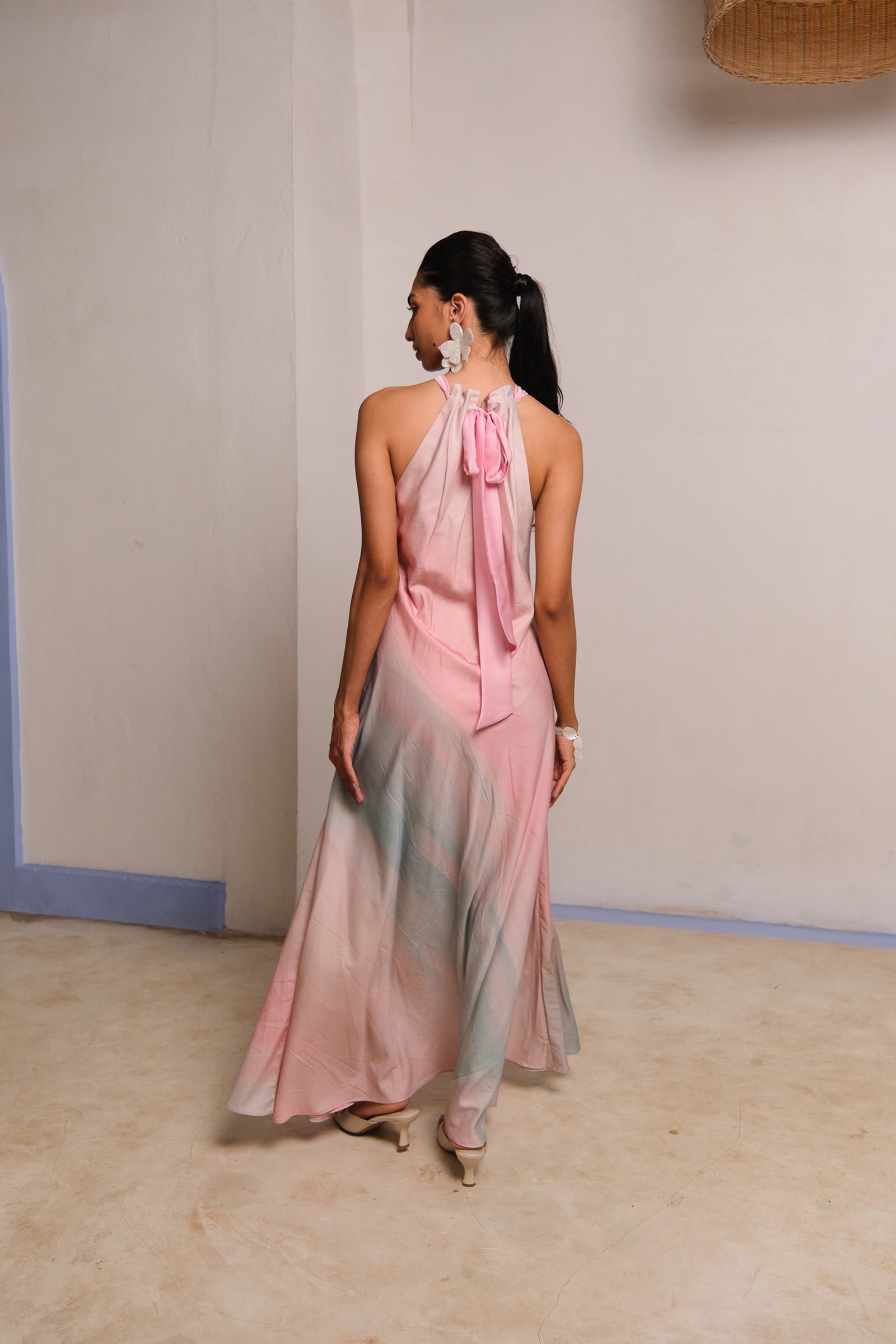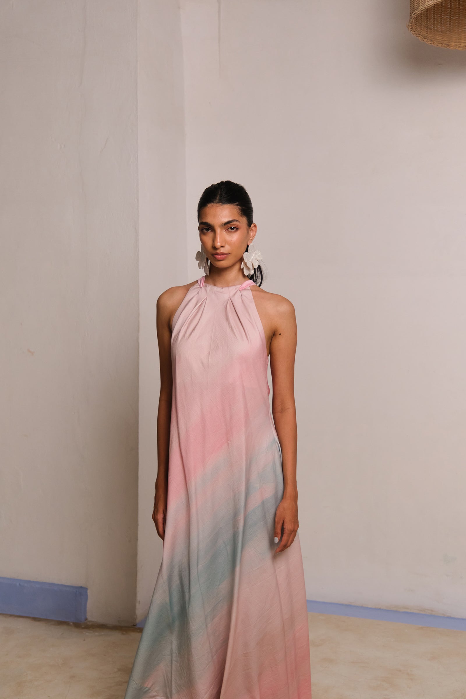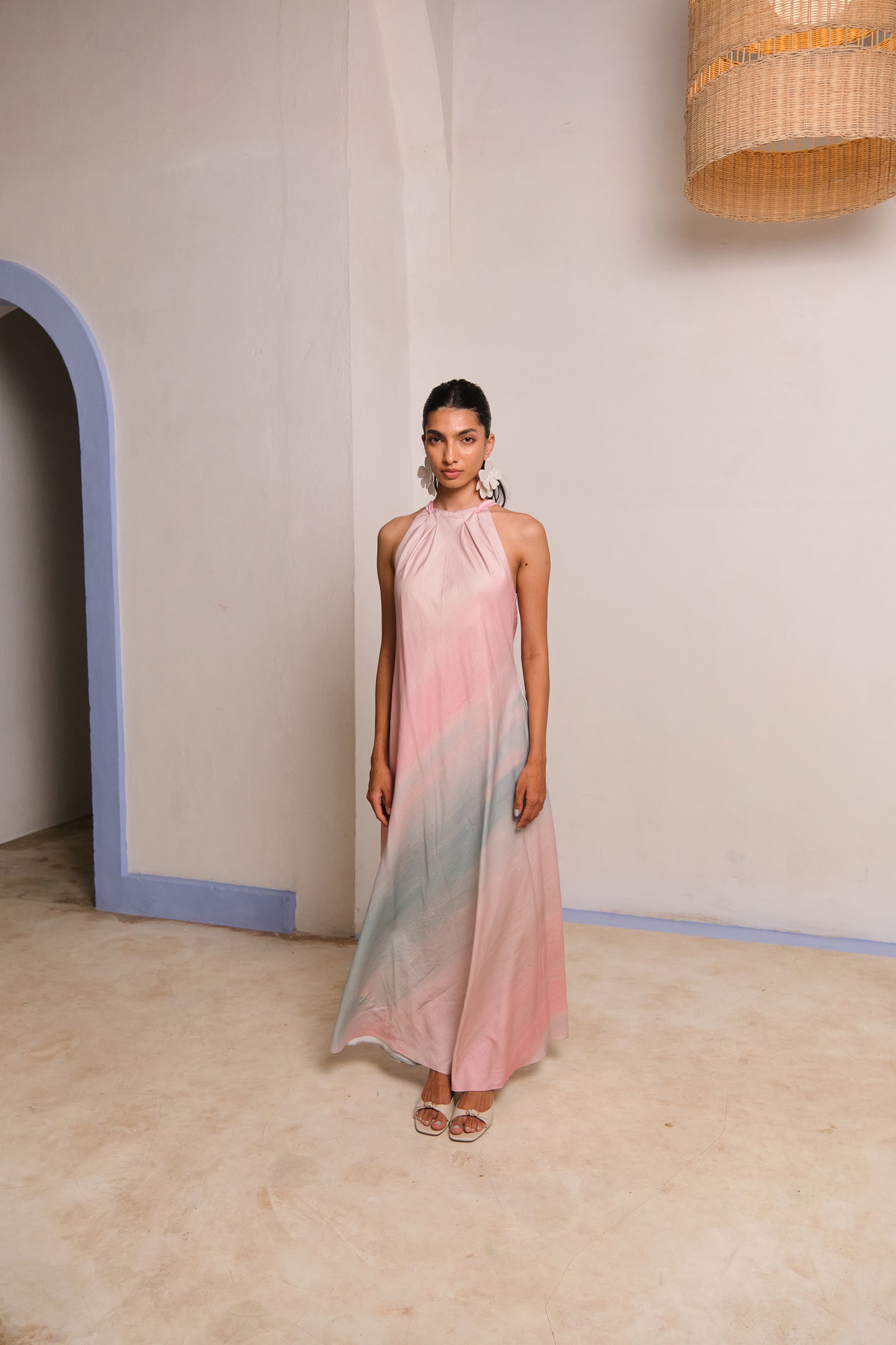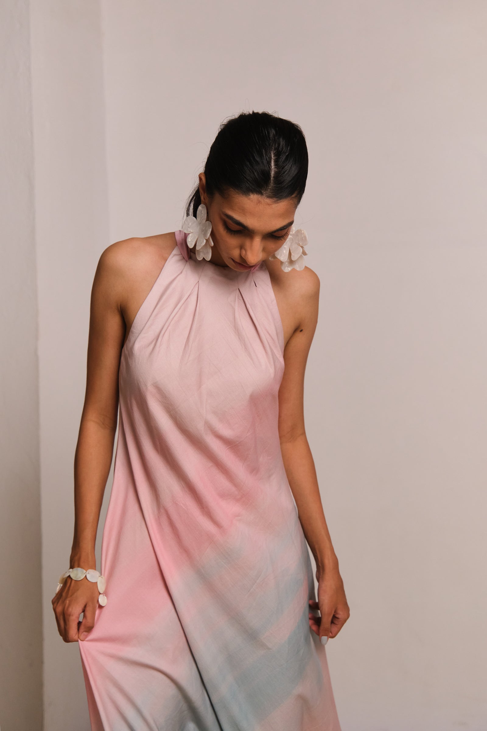 This ocean mist halter neck dress radiates effortless elegance. Its soothing color with a satin neck tie around the halter neck offers a playful touch. The flowing silhouette cascades gracefully, capturing the breeze and your imagination alike. The halter neckline enhances your collar bone. This is a perfect dress for sunlit strolls and moonlit dances.
