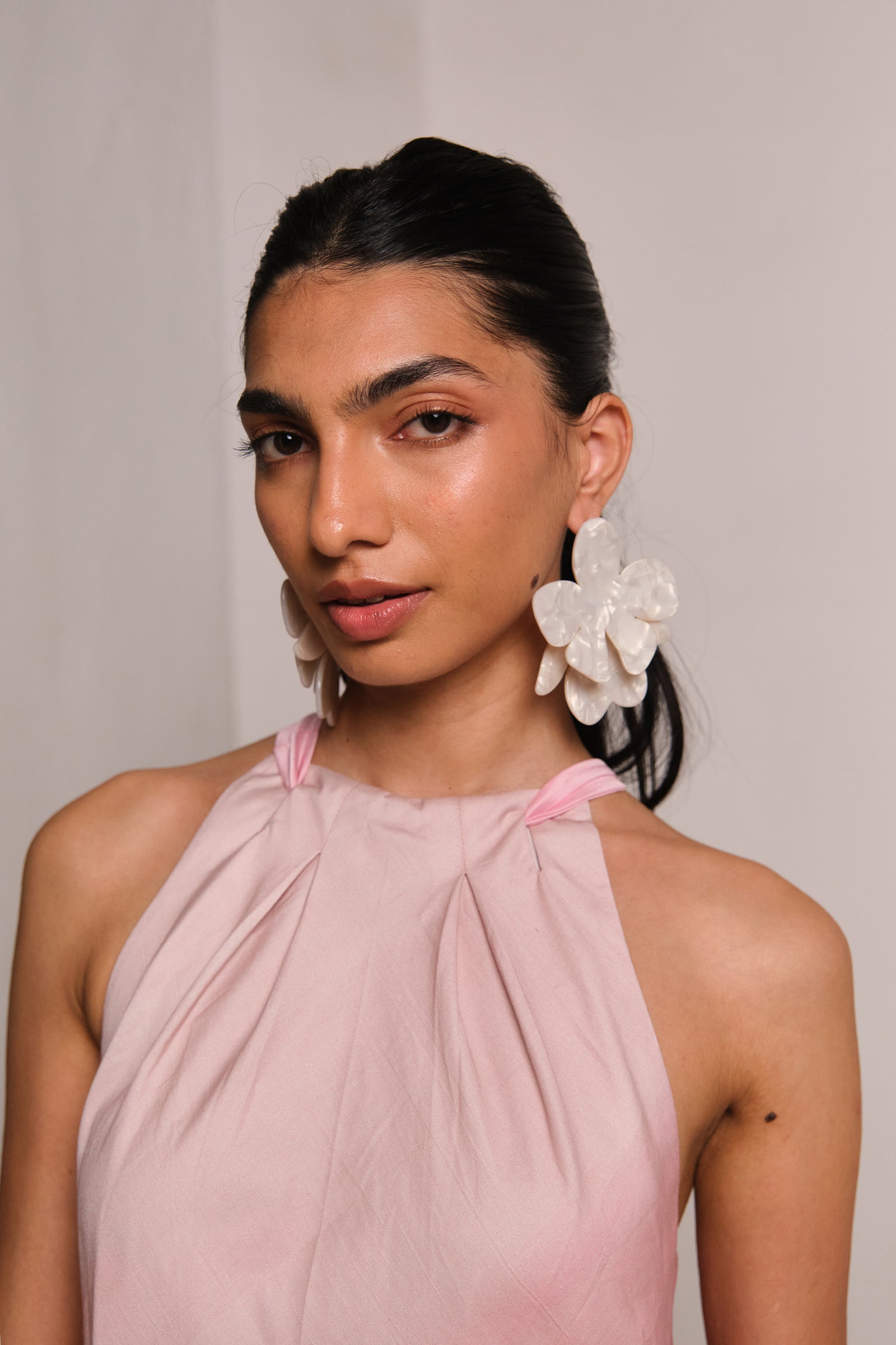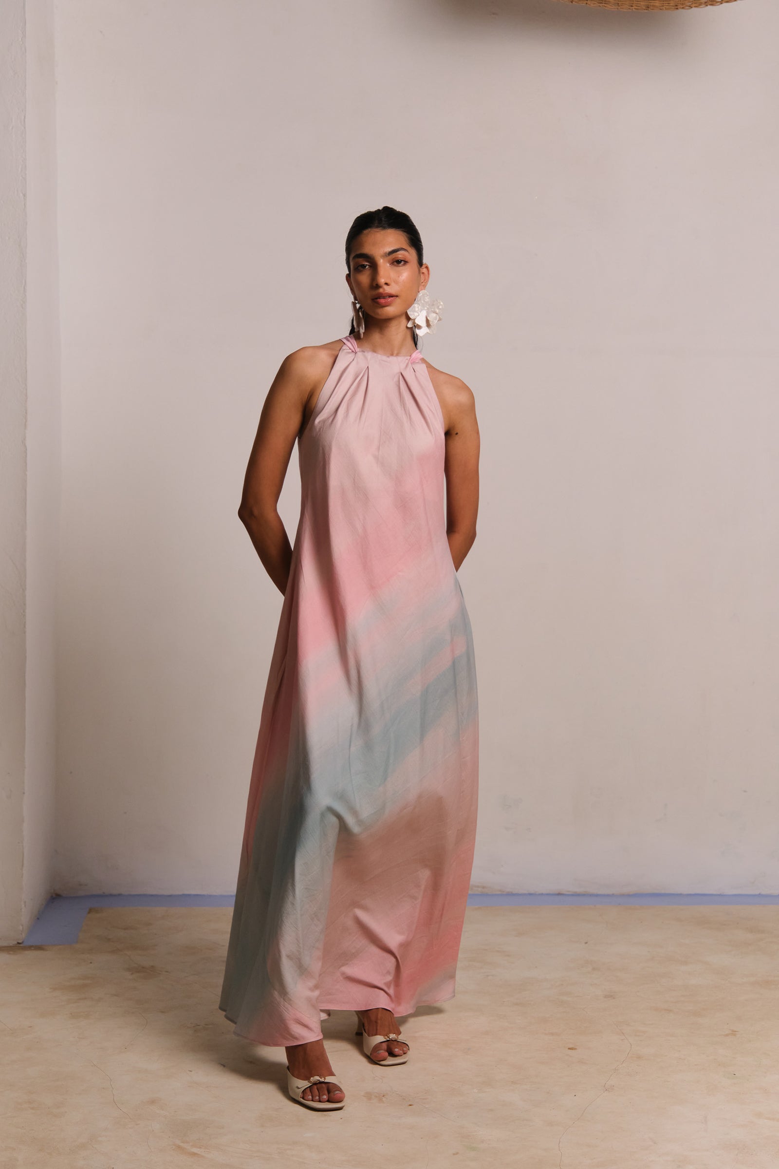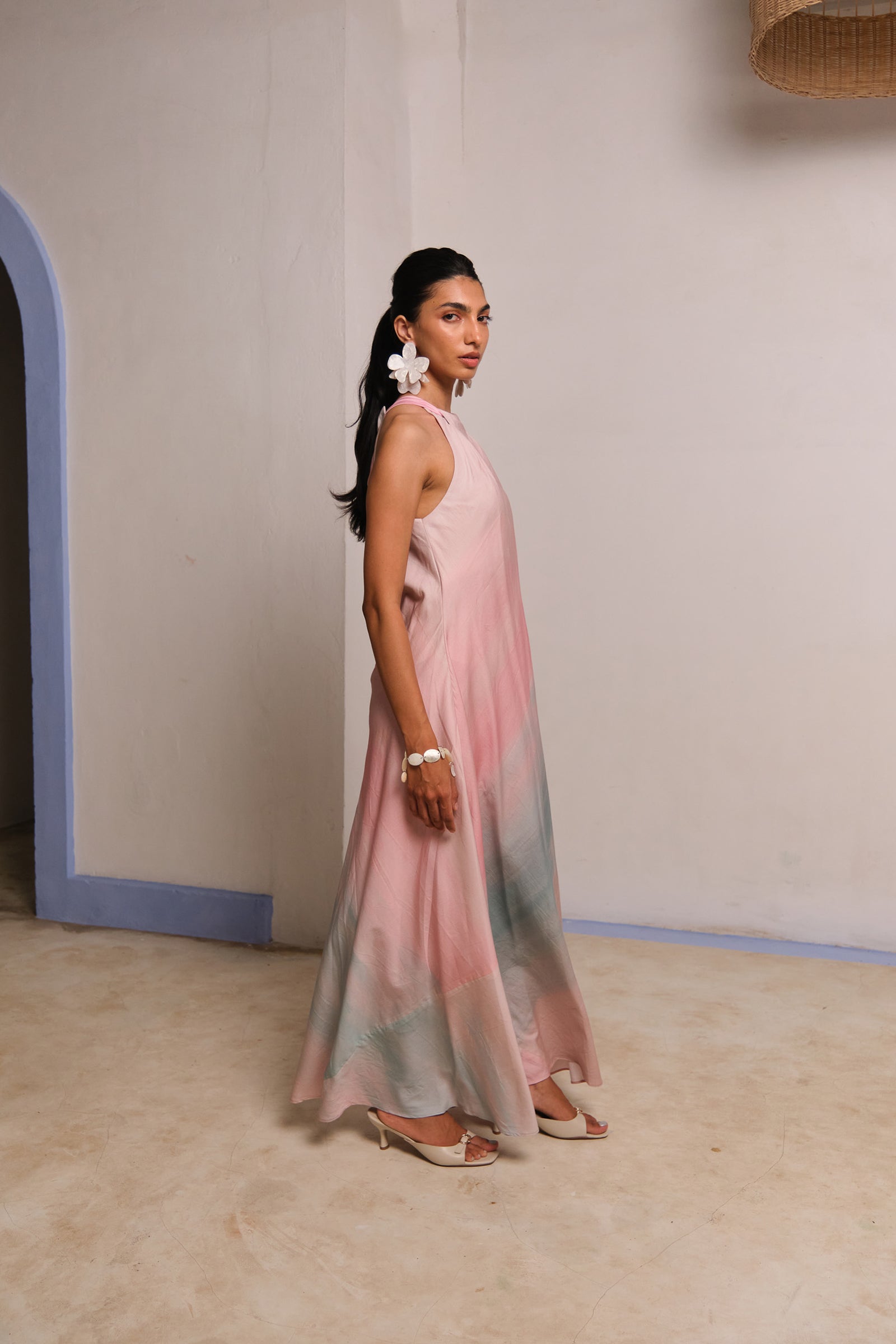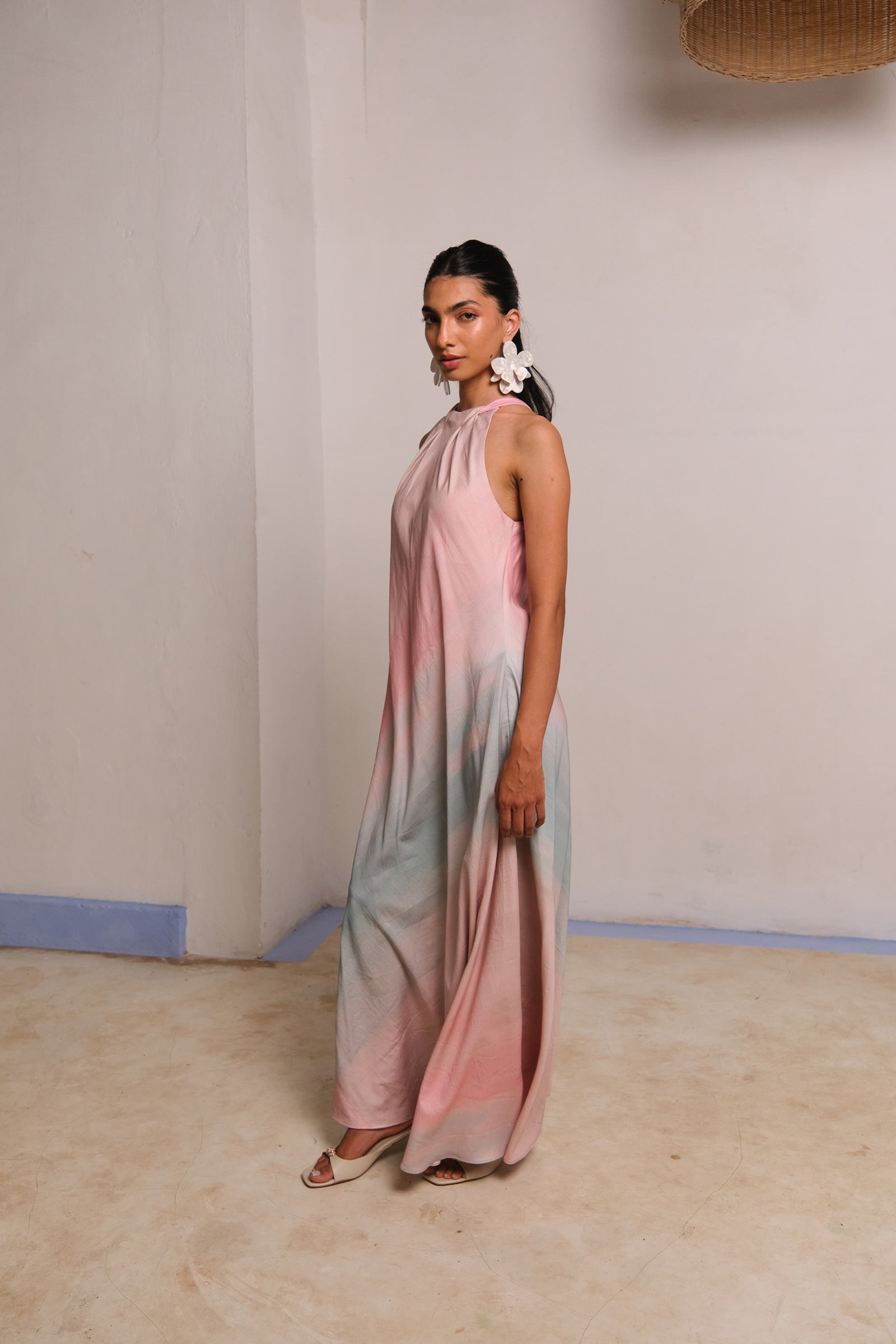 This ocean mist halter neck dress radiates effortless elegance. Its soothing color with a satin neck tie around the halter neck offers a playful touch. The flowing silhouette cascades gracefully, capturing the breeze and your imagination alike. The halter neckline enhances your collar bone. This is a perfect dress for sunlit strolls and moonlit dances.
