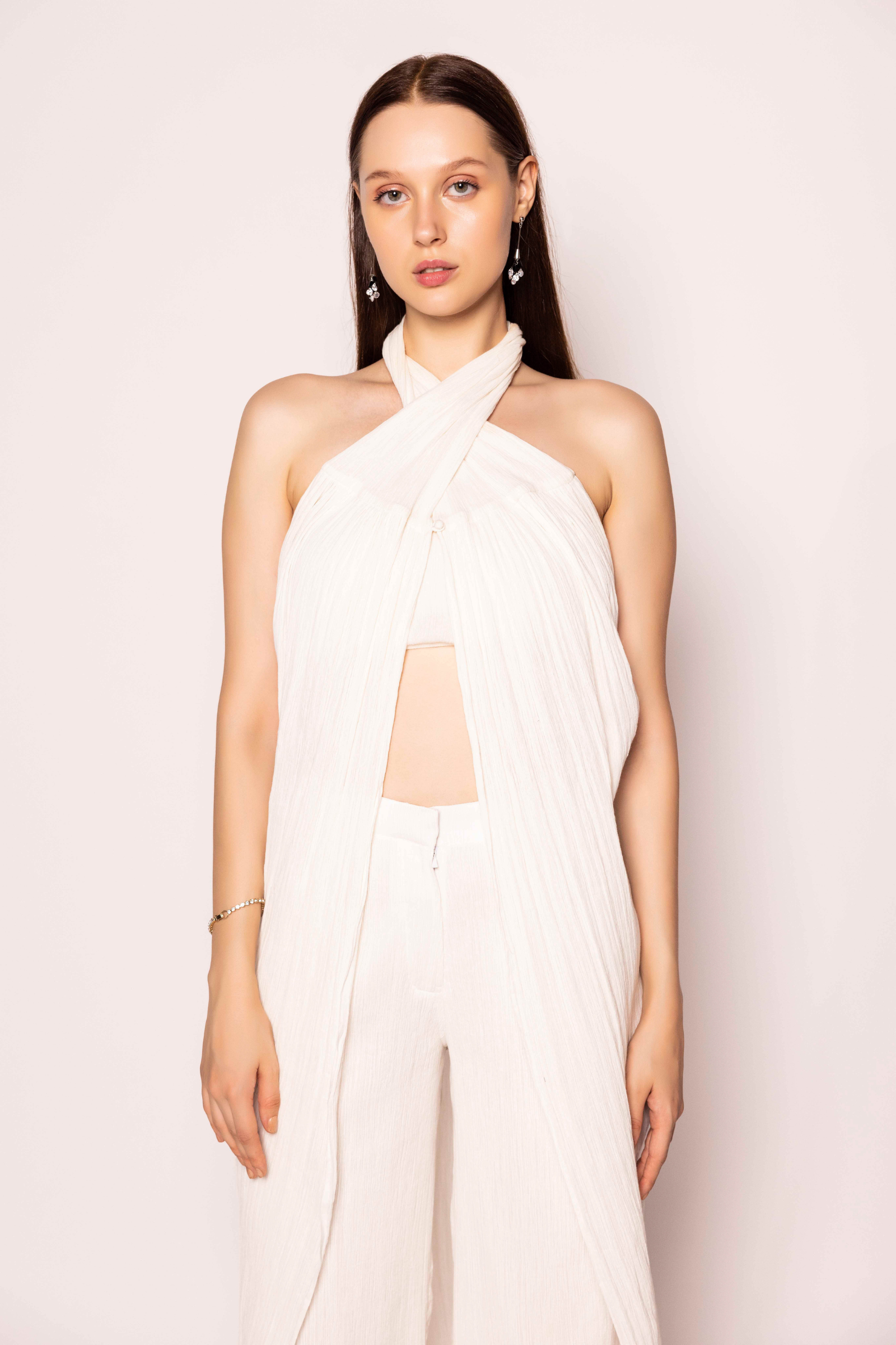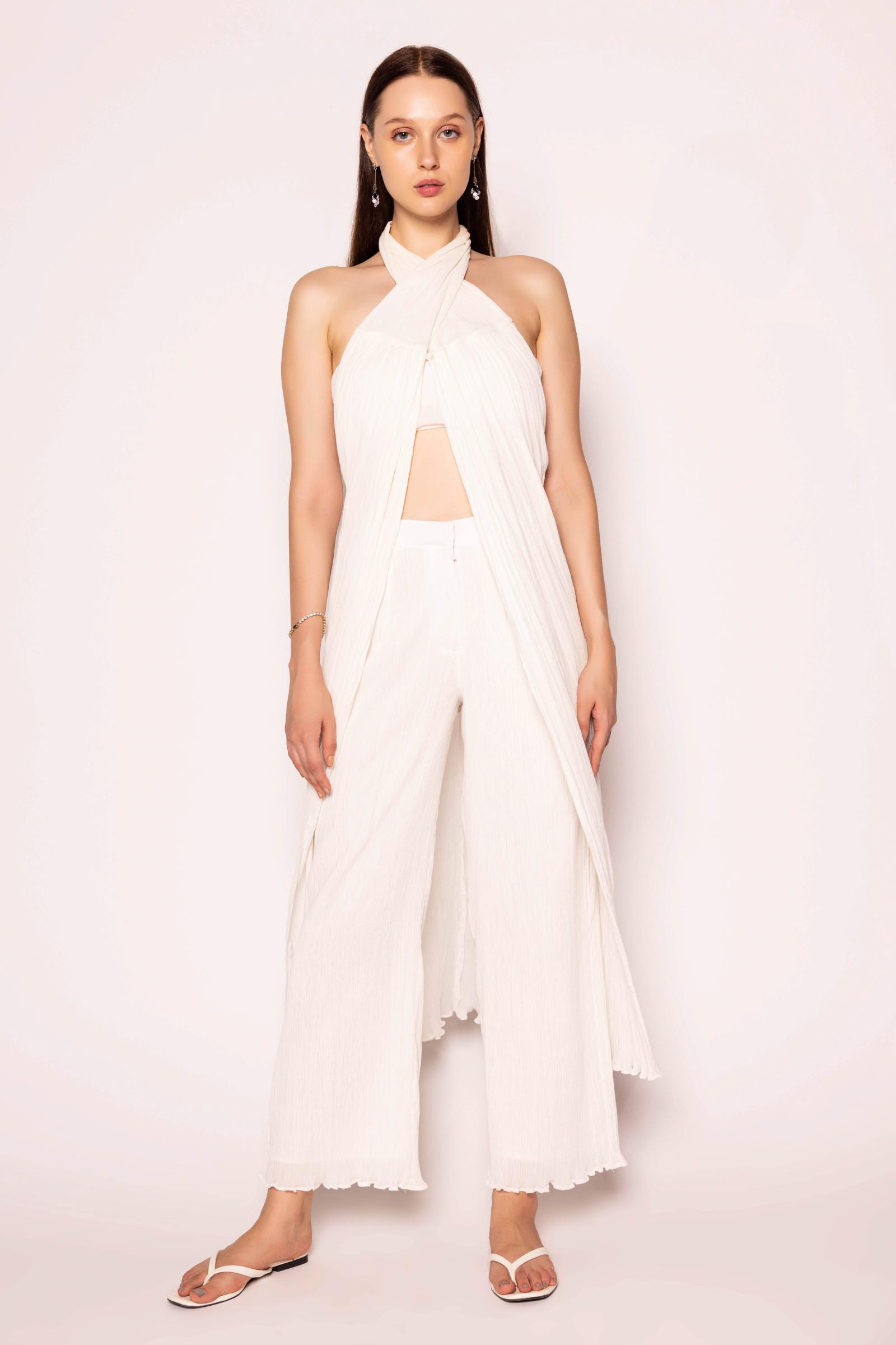 An unexpected silhouette that’s destined to be your new favourite set. The best part of this set is you could style them in multiple ways. For instance, the pants would go with a hundred other tops in your wardrobe, and the cris-cross wrap with a bikini? A perfect wardrobe for your next beach vacation is sorted.