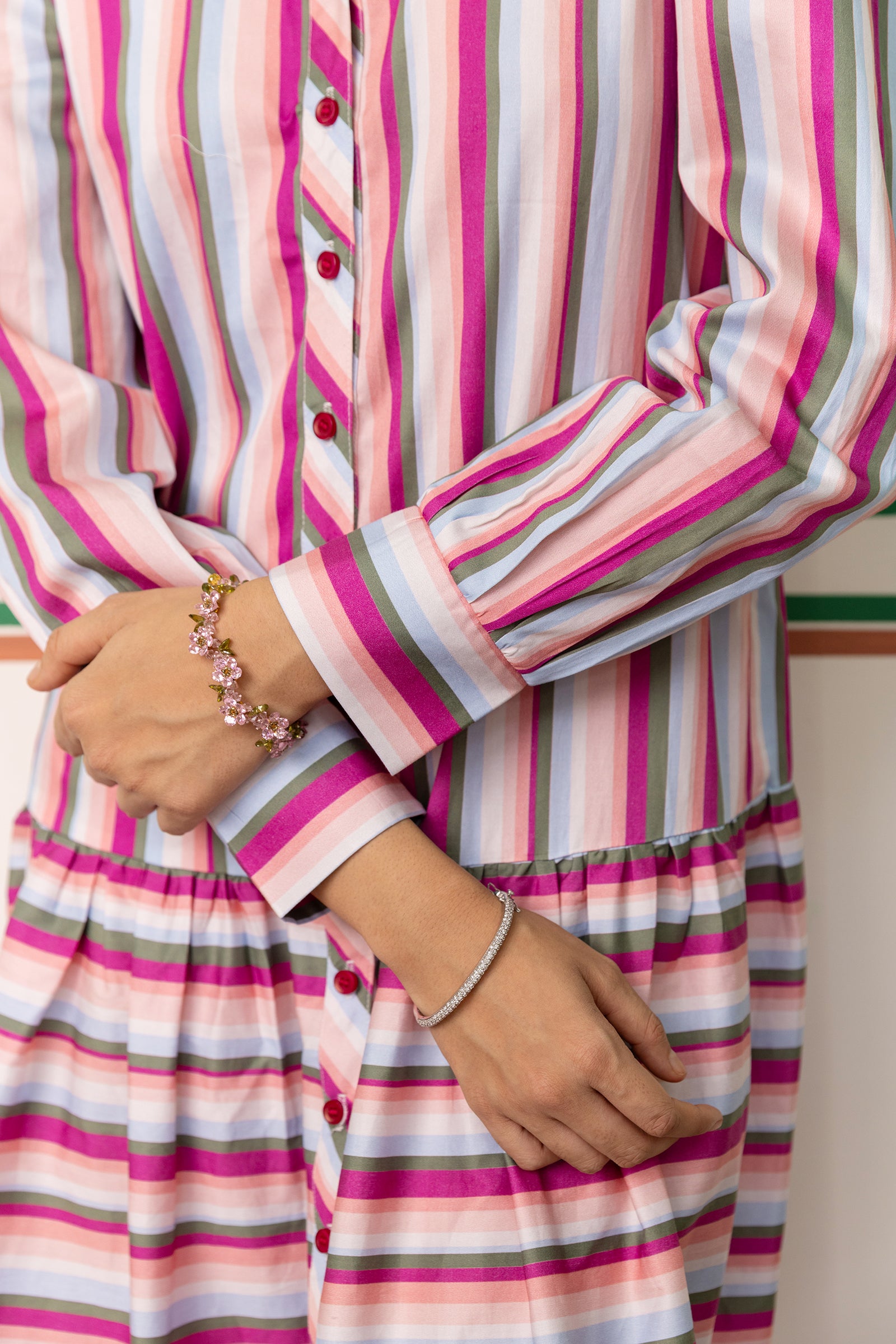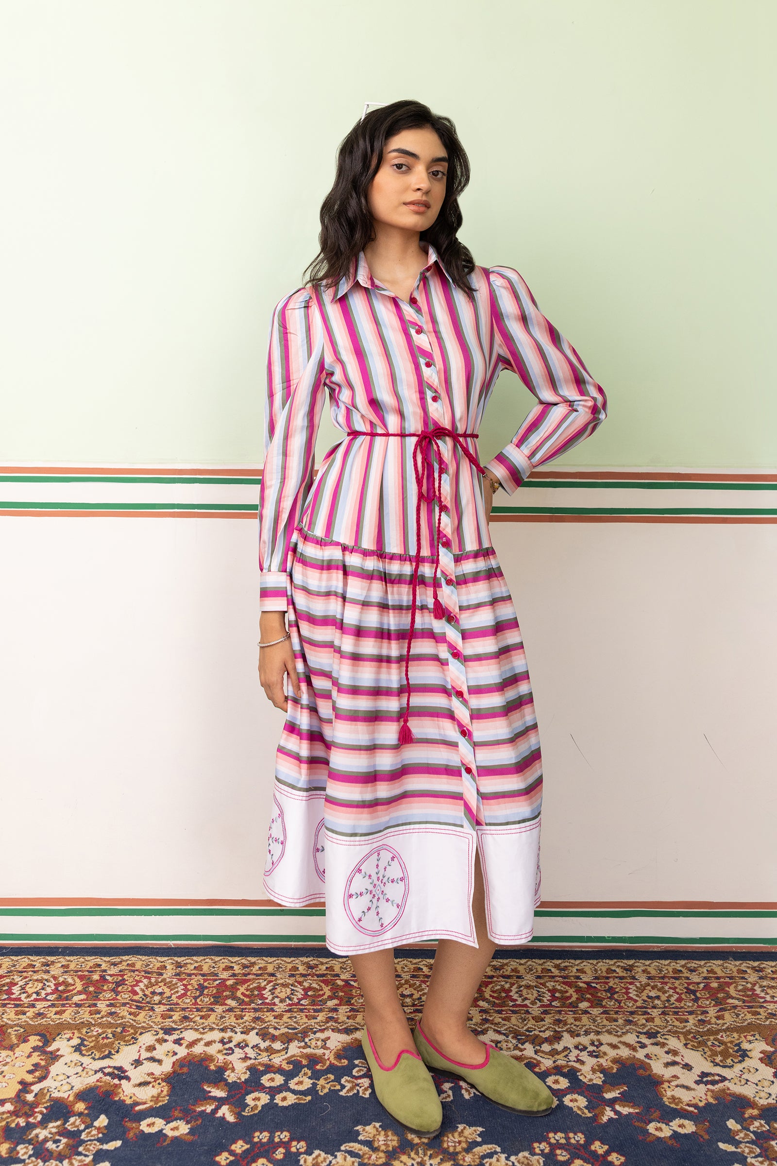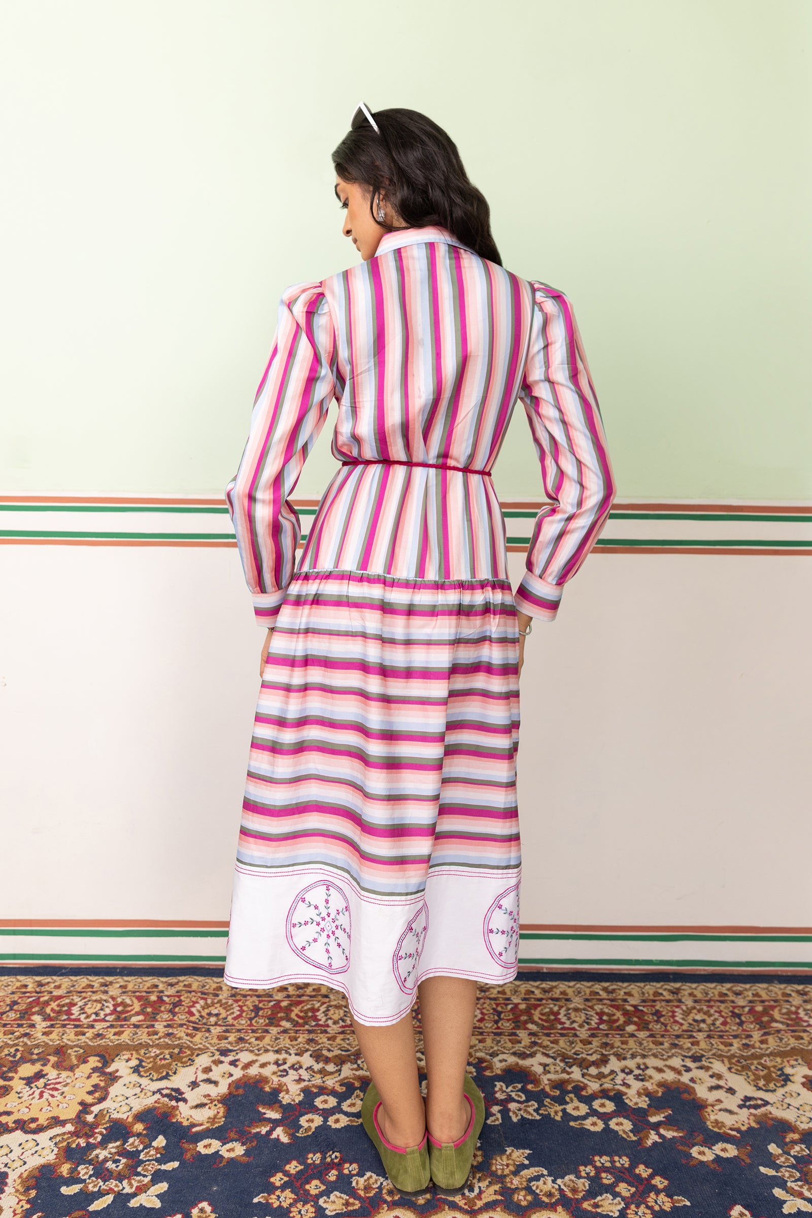 Border designed to absolutely match the dress and bring out the very best in you .The beautiful 70s inspired cut having a combination of beautiful fit until the mid thighs and then flaring out to give the most striking silhouette. This dress is a perfect stand out day to evening wear. We can totally imagine you slaying in your brunch/ high tea parties with this dress on. The little braided belt helps you get a cinched waist defining your body shape flawlessly.