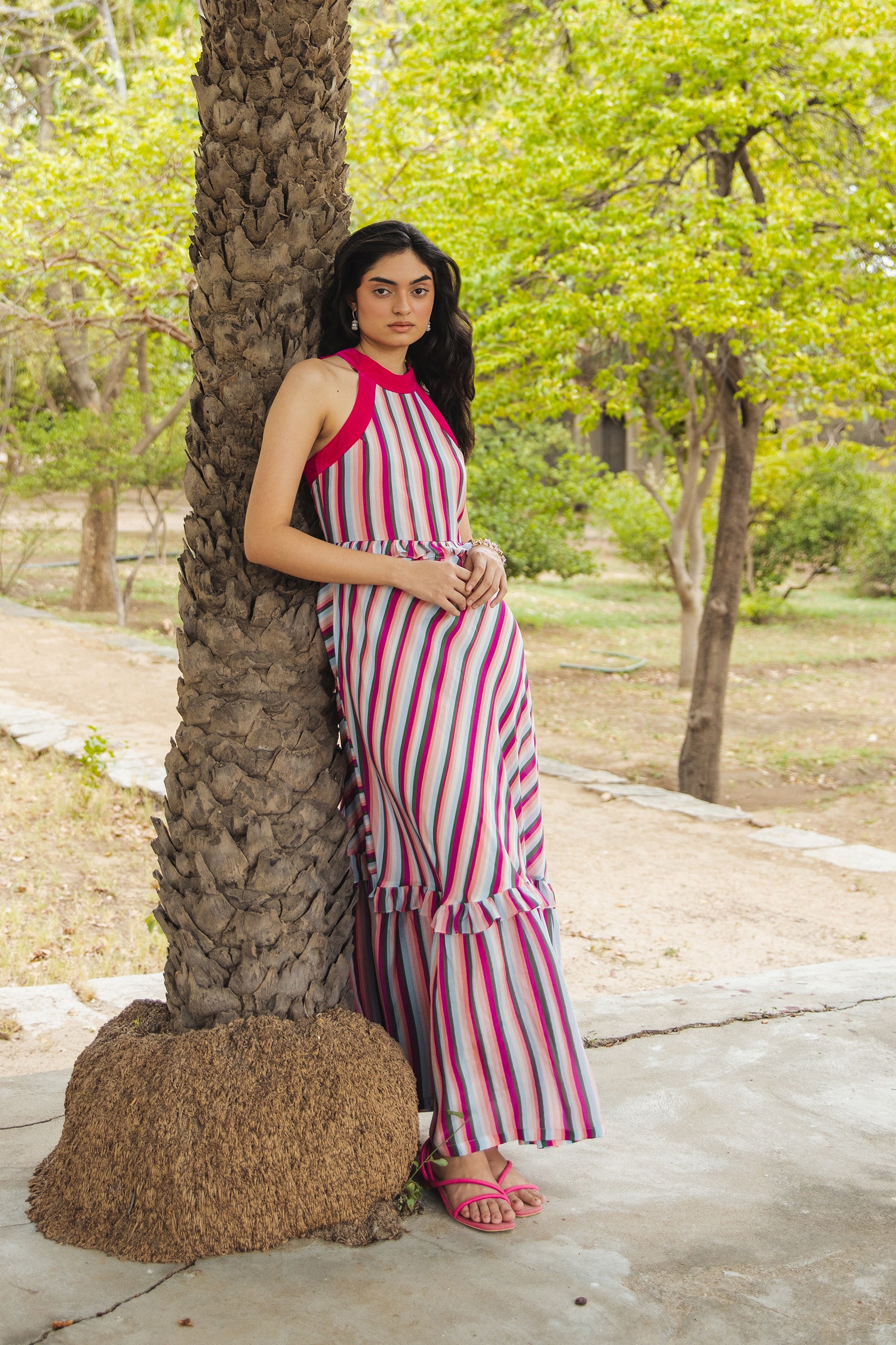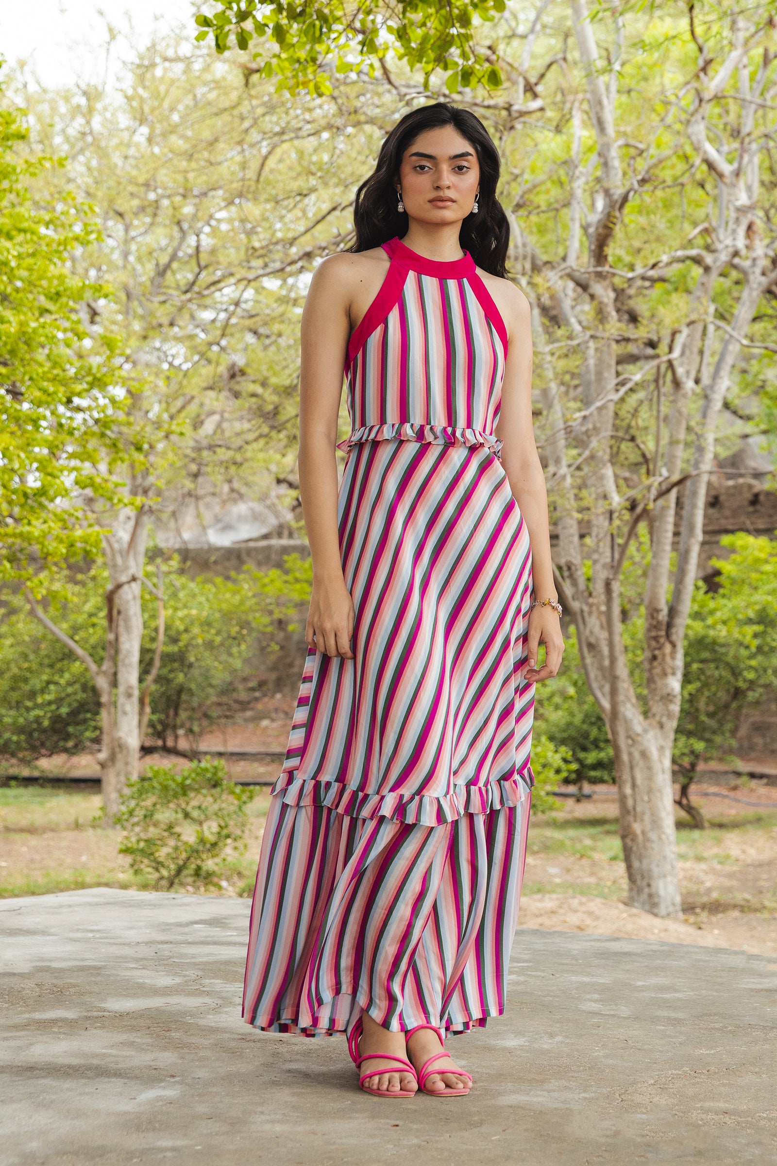 Our signature gown is back with a whole fresh look. The stripe placements in the gown adds a whole new drama to it and screams slip on and getaway.Pack it up and wear it on repeat on your next vacation , you ll find it’s a wardrobe MVP. The flowy fabric makes you look graceful every move while the colors make you look a bold strong lady. Isnt this a perfect combination ?