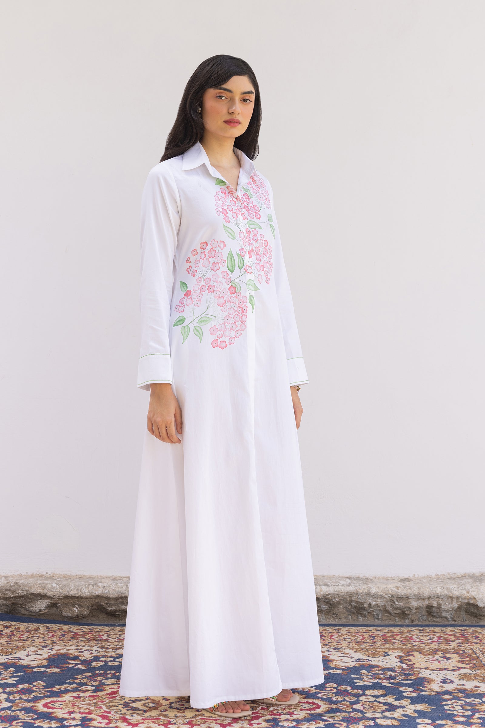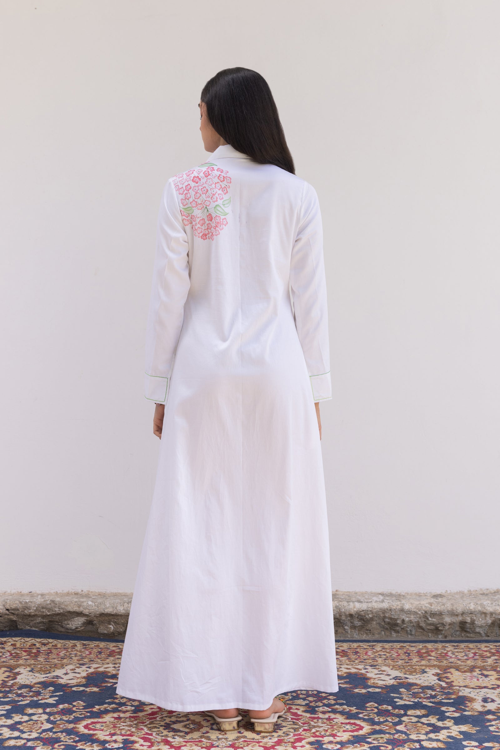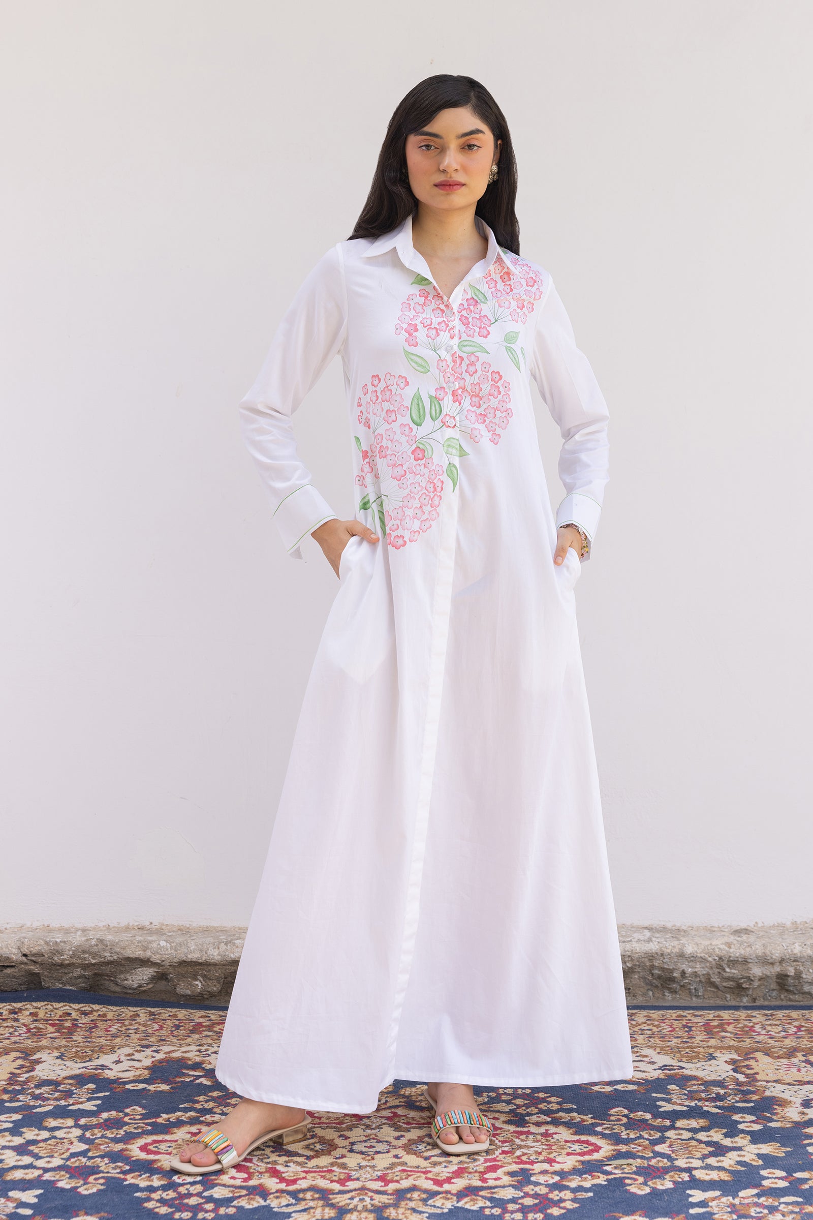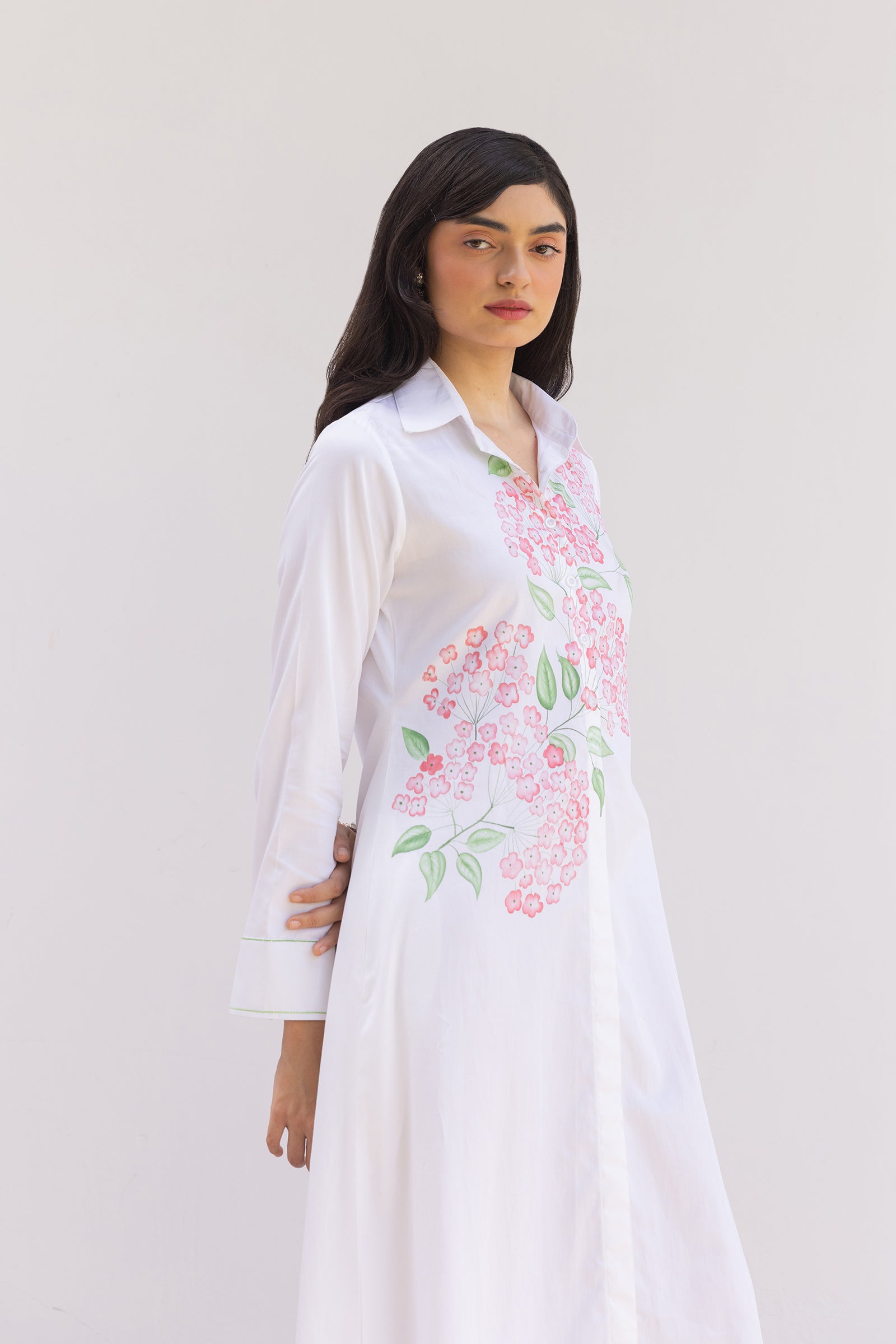 Not your average white shirt dress. With beautiful hand painted flowers , this dress is a true reflection of joyful artistry and effortless style. The watercolor effect on flowers are creating a fluid symphony of pink. This style has a story to say on its own and a signature Shimona style with 4C Factor our label believes in – Classic, Chic, Conscious and conceptual. A simple but stunning long sleeve makes it easy to wear and carry.
