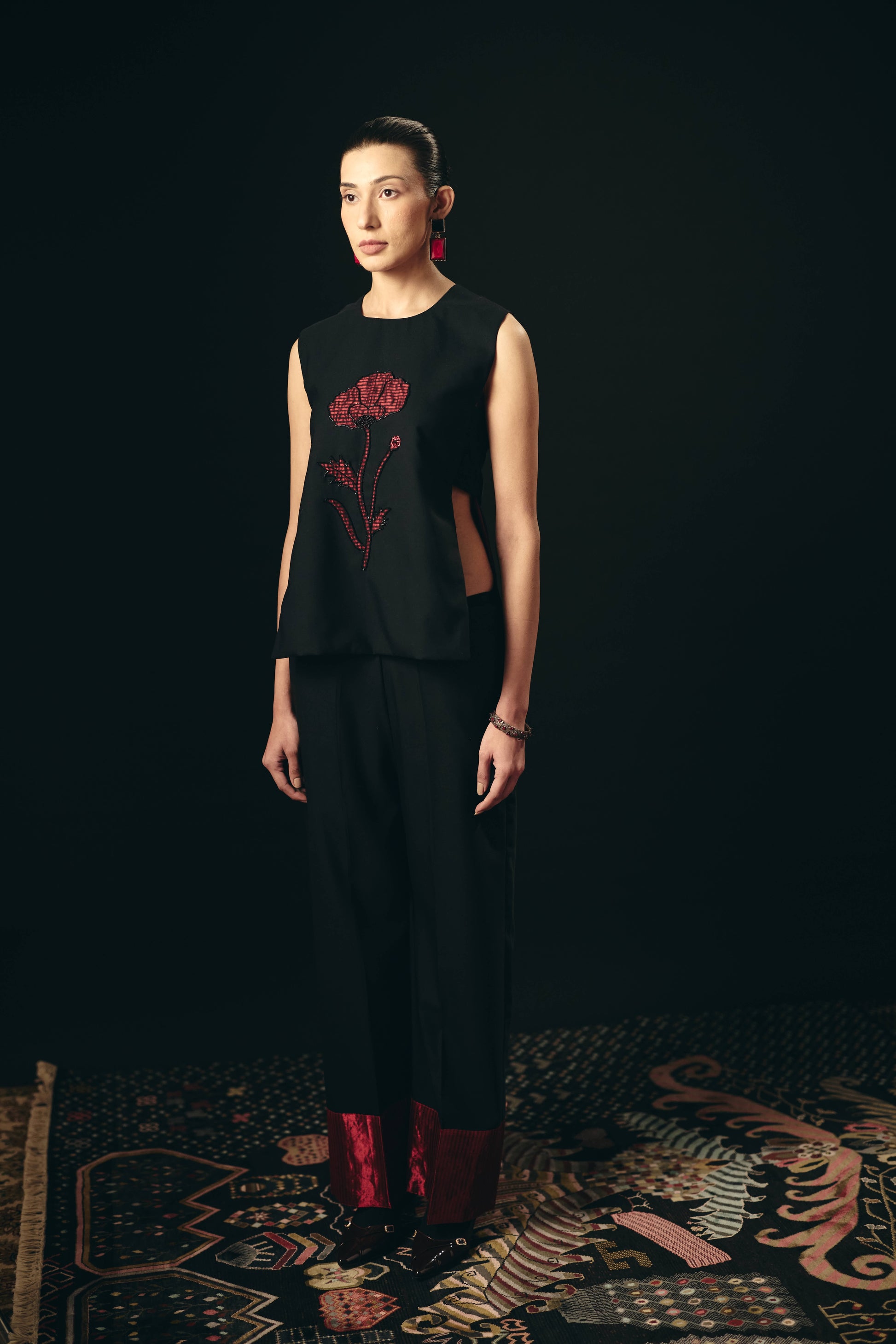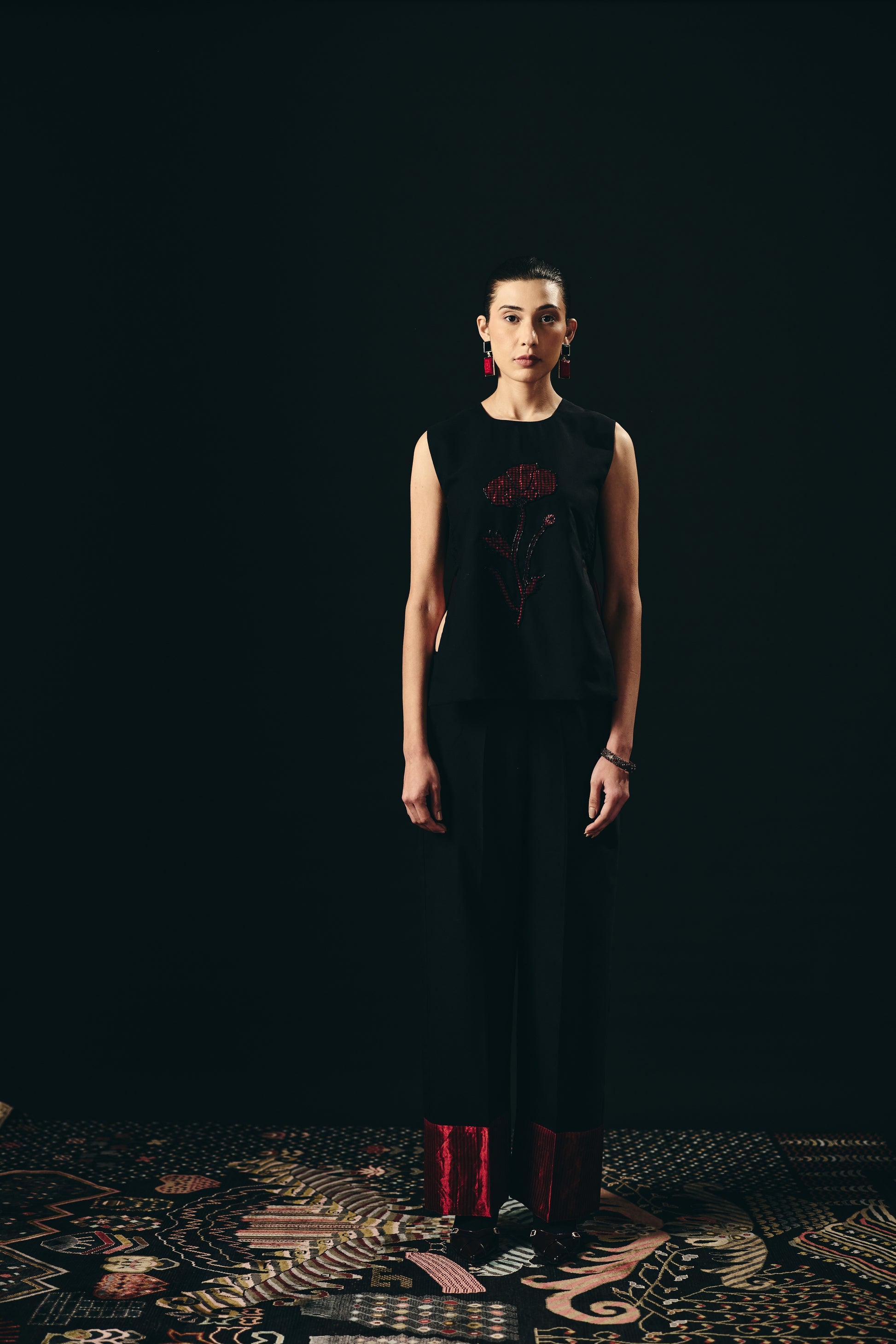 A bold evolution of our signature aesthetic, the Crimson Rose Set combines minimalist tailoring with vibrant, artisanal textures. This two-piece ensemble from the She Rises collection is designed to command attention through deep tonal contrasts and meticulous hand-embroidery. Specially designed and hand-spun for this collection, the fabric stands as one of our signature creations.