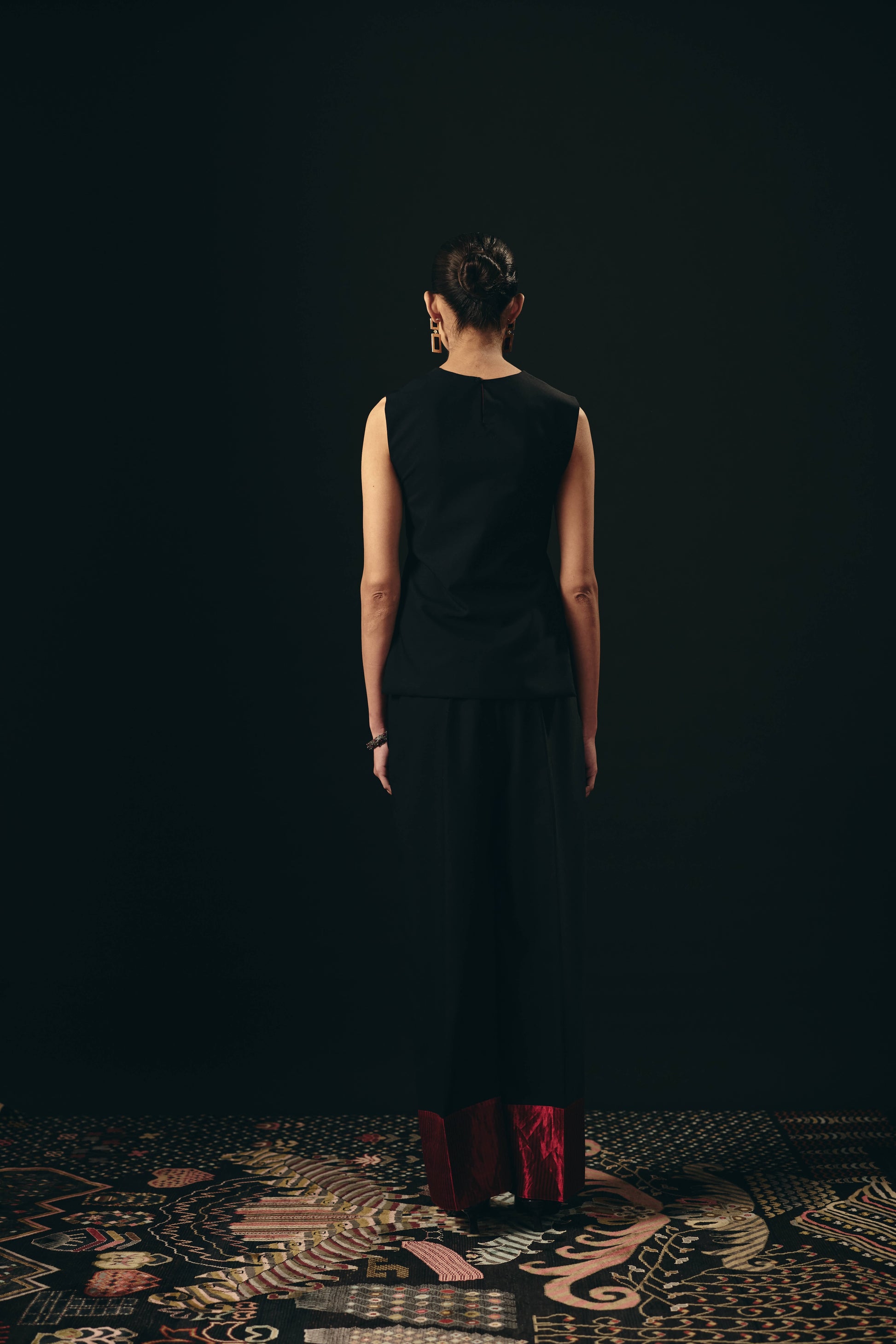 - The trousers are finished with luxurious silk cuffs in deep red.