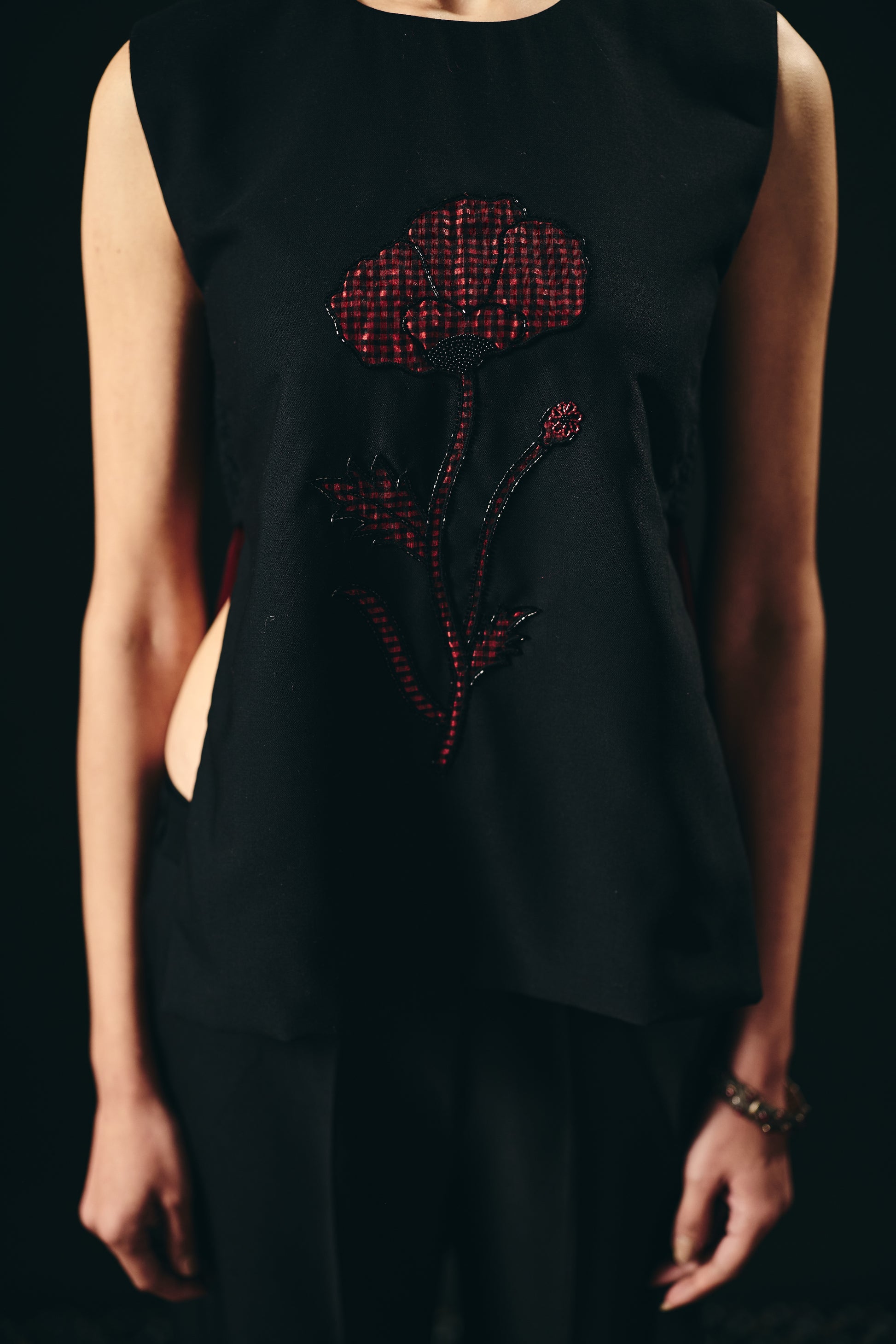 - The center of the top features a single, hand-embroidered rose in deep crimson.