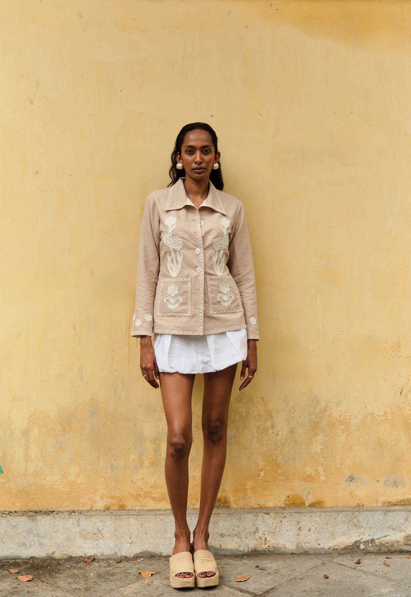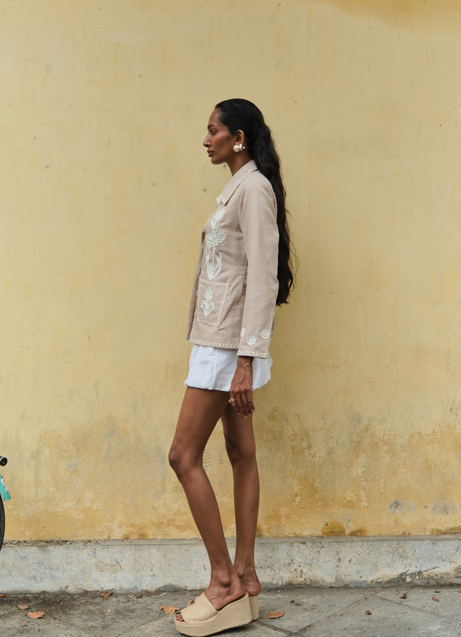 One of our signature pieces and a true masterpiece of all times. The linen jacket features skillfully crafted sea folk applique hand embroidered with every minimal detail leading to a signature, timeless look. The embroidered outlines create a bold interplay of texture and negative space. Modern, daring and endlessly versatile, this jacket is where elevated and everyday meet.