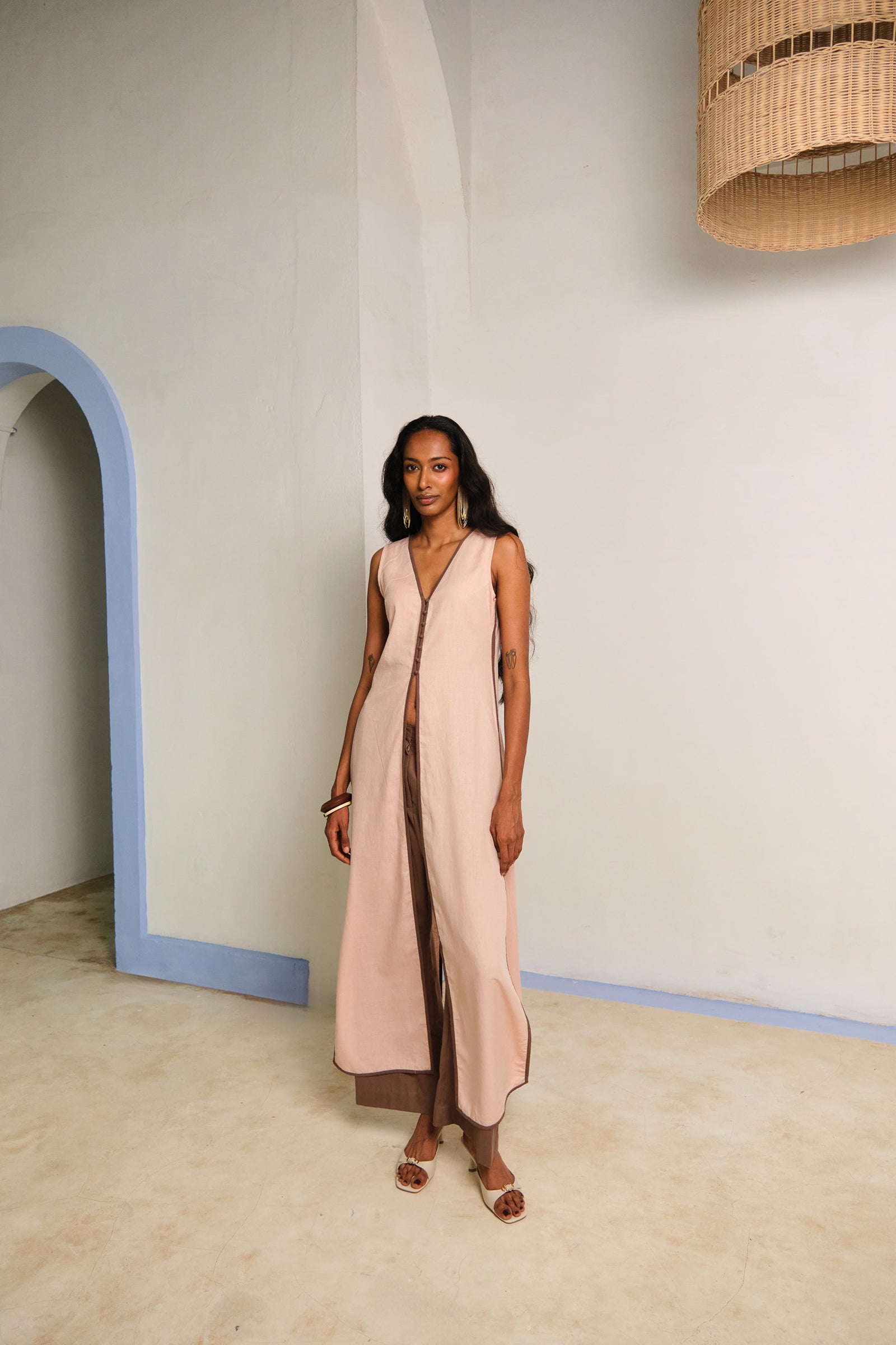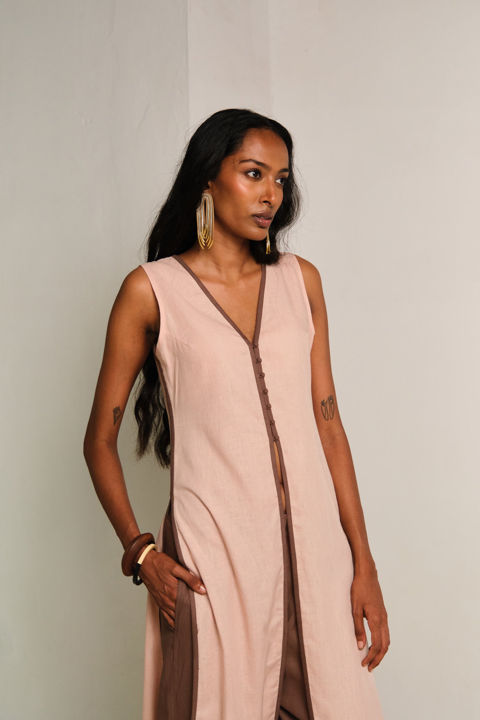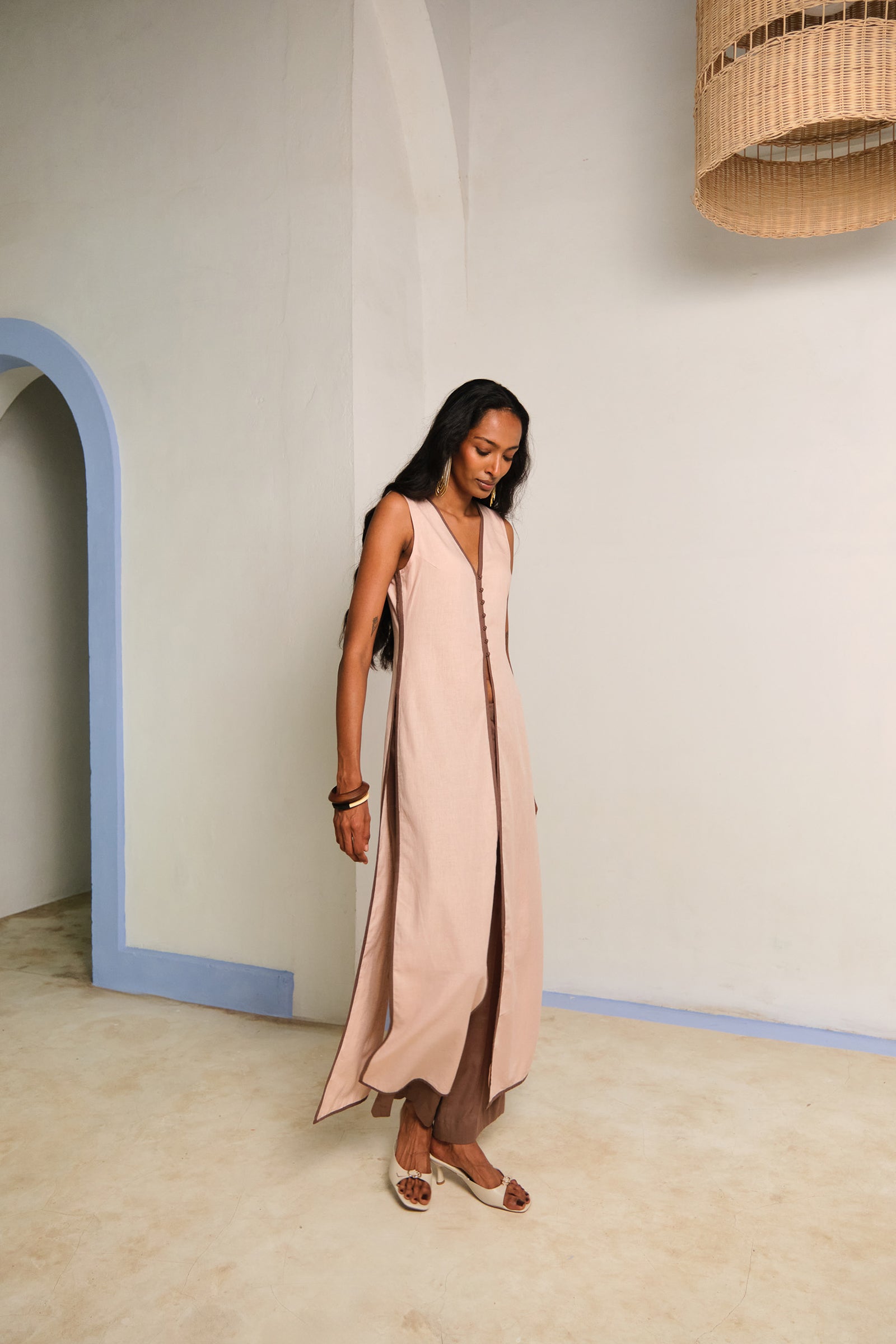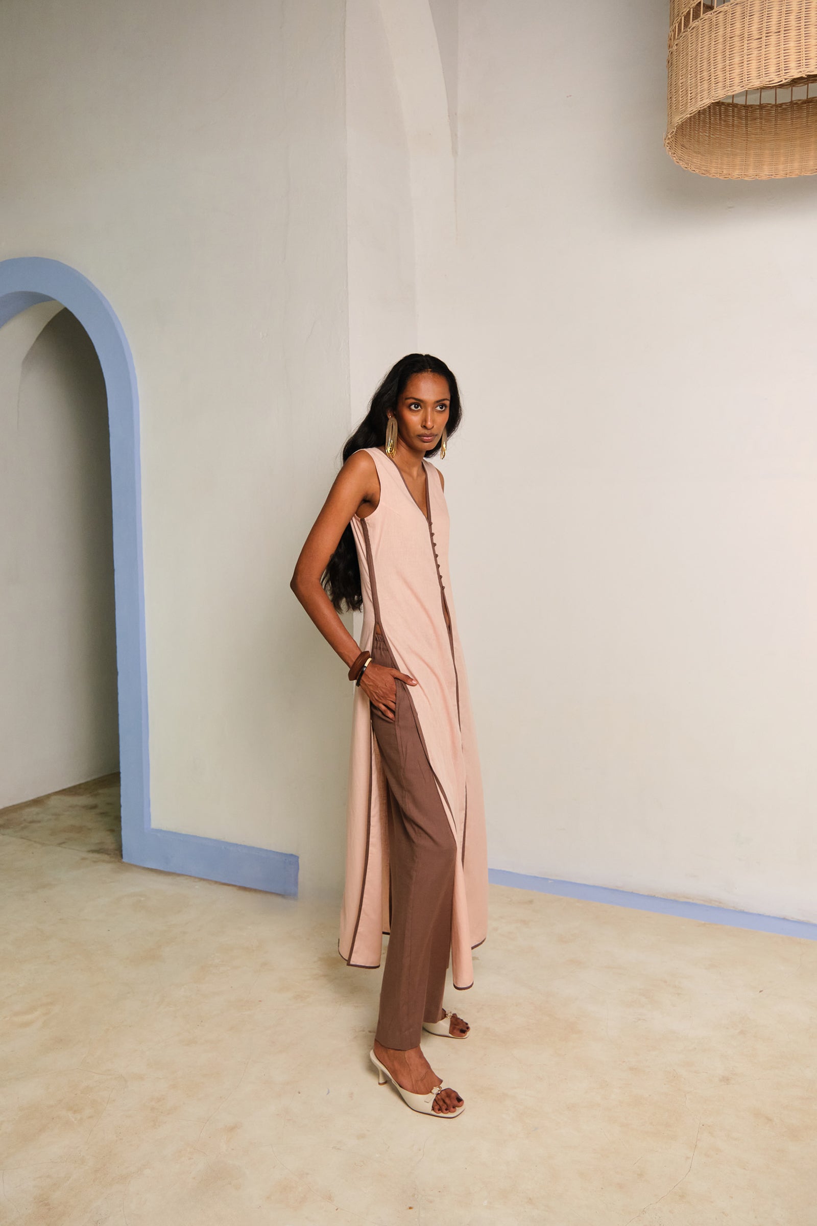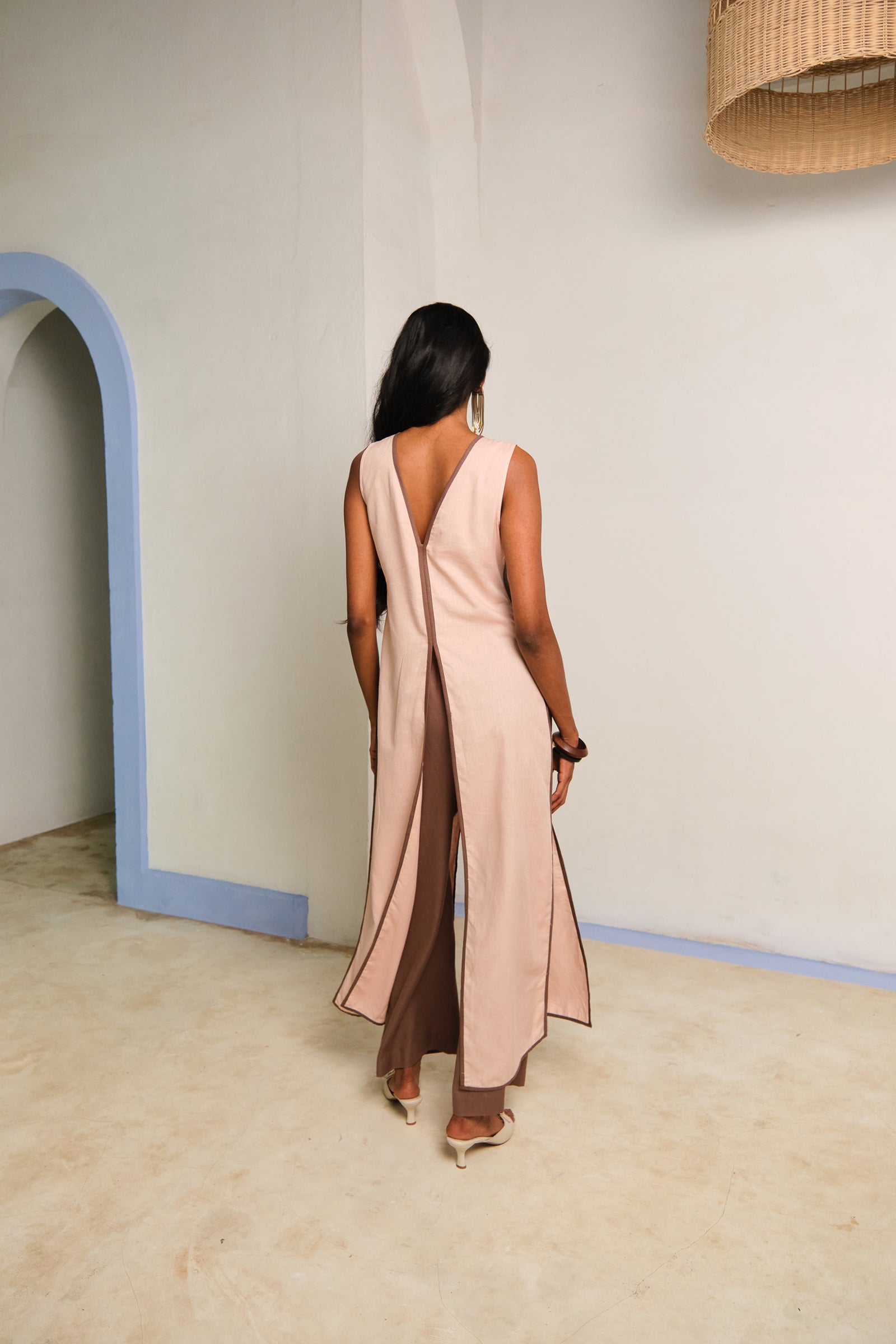 Sleek fit with sexy slits, this one is our favourite. The set features a long 3-slit tunic with wide pleated pants in cotton linen. Pair this with the tunic that comes along for a formal set and swap it for a tank or a cute crop top for happy hour.