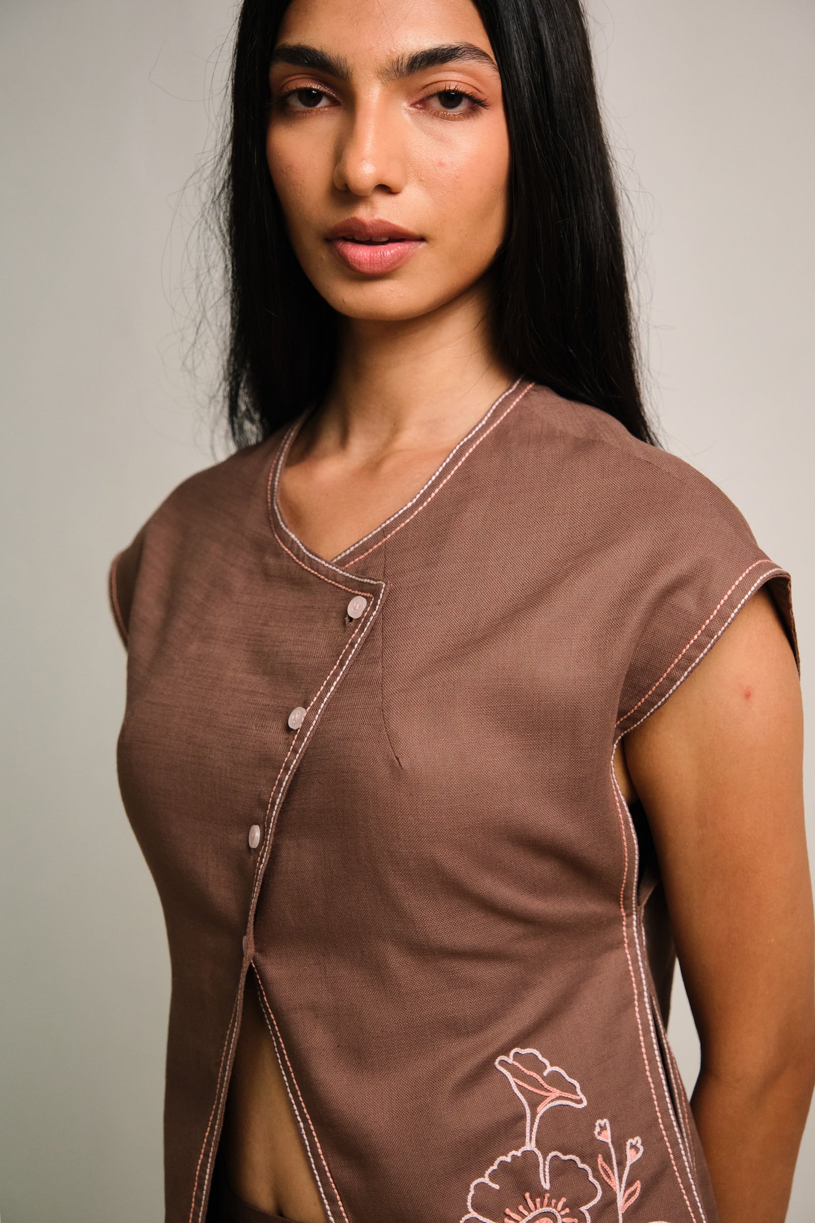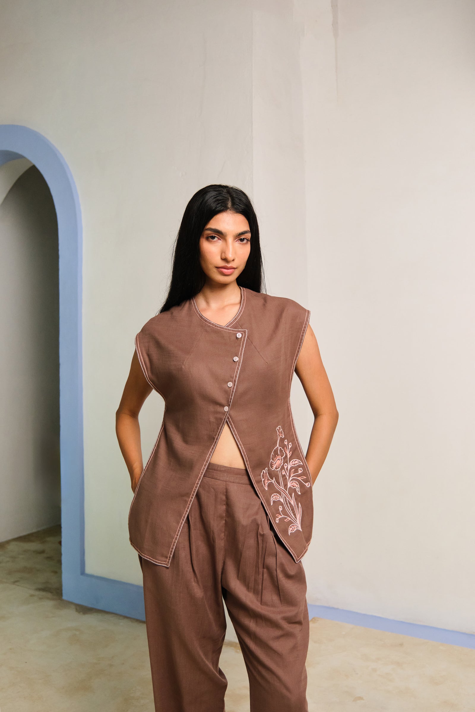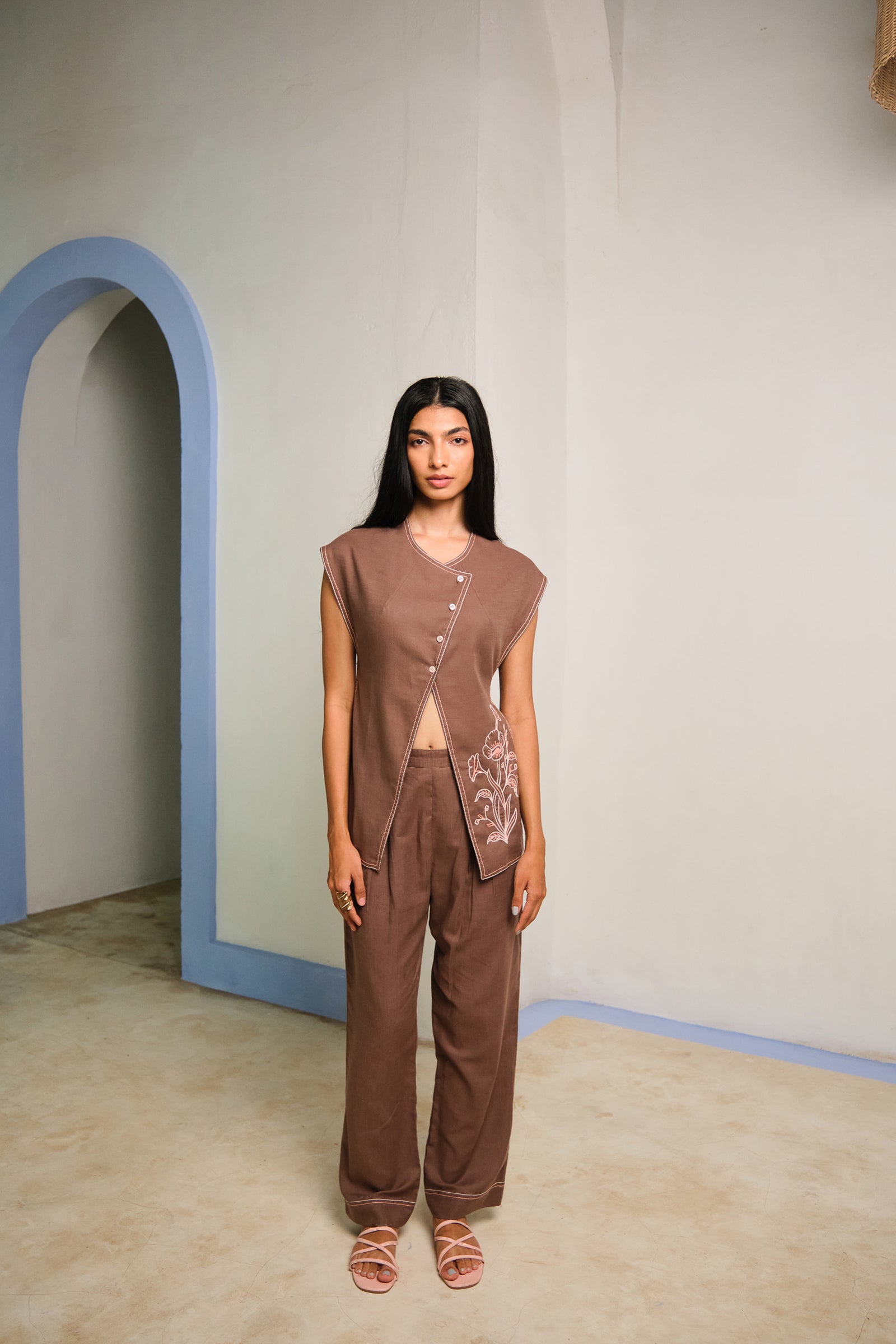 A sleek fit overlapping top with embroidered sea florals is a comfortable yet dressy set. It comes with pleated wide leg pants. This is a super versatile set. The silhouette has a classic fit yet experimental, making you stand out in the crowd. Bold yet refined, it’s a staple you’ll reach for again and again.